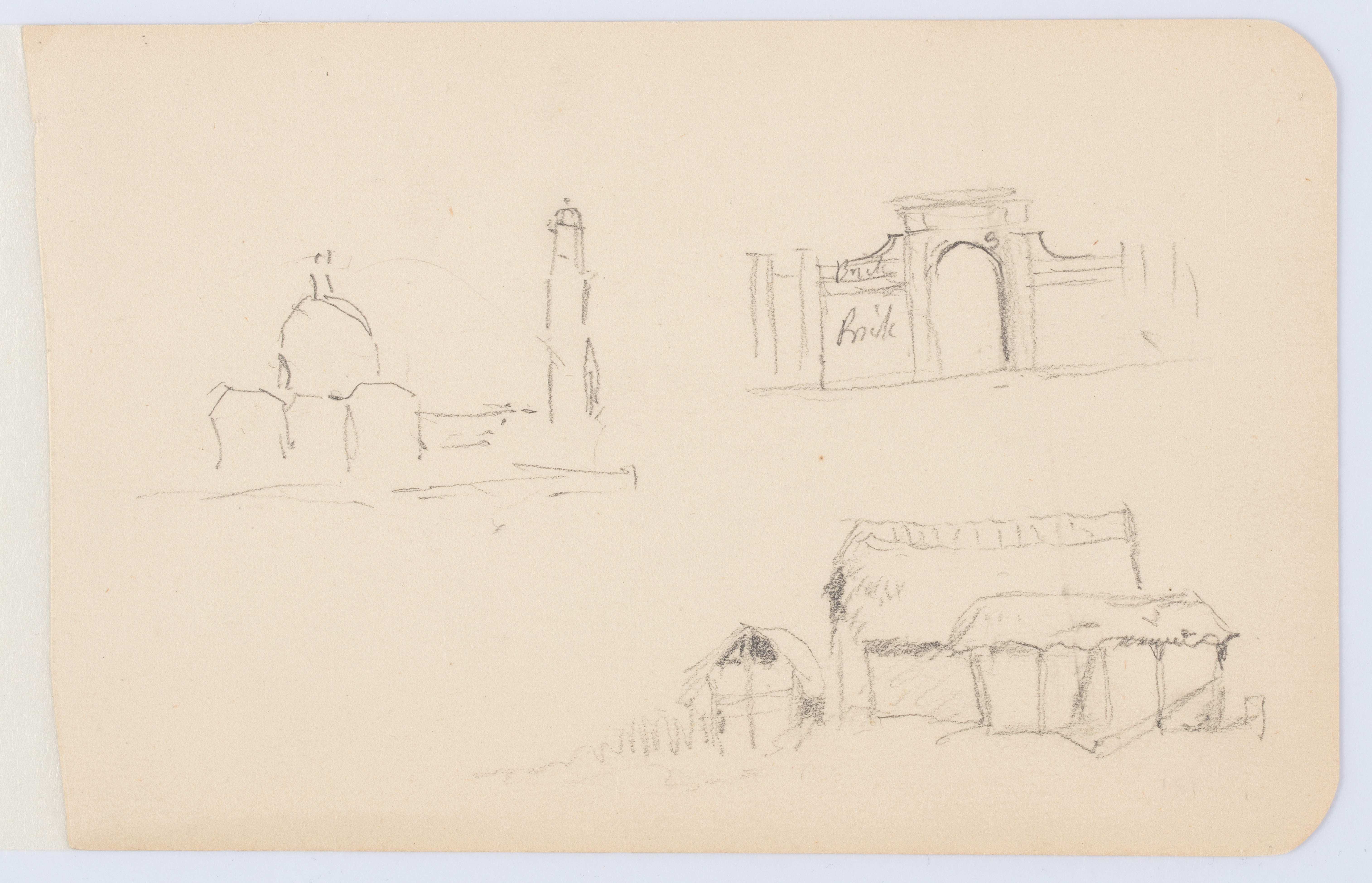 Drawing, Sketches of Buildings in Mexico; Frederic Edwin Church (American, 1826–1900); USA; graphite on off-white wove paper; 10.2 × 16.6 cm (4 × 6 9/16 in.); Gift of Louis P. Church; 1917-4-1256-a