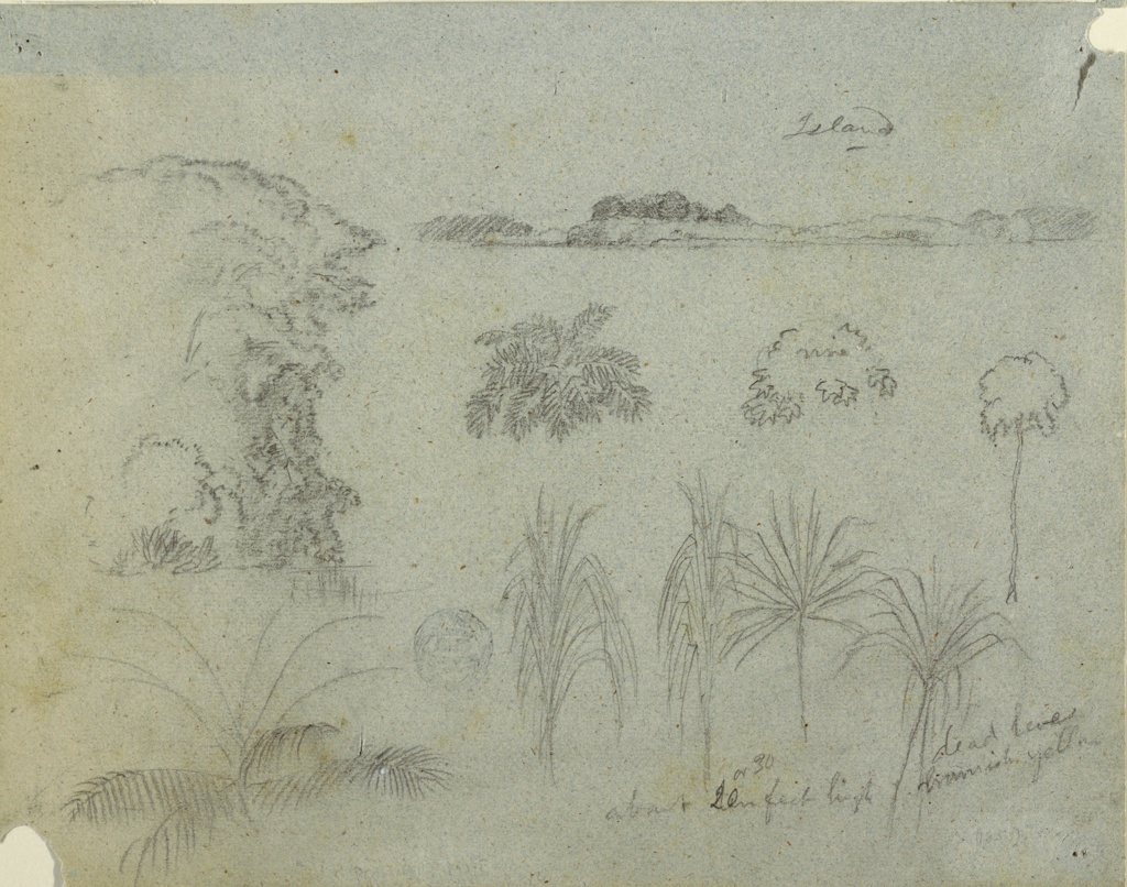 Inscribed: in graphite, upper right: Island; in graphite, center right: vine; in graphite, lower right: about 20 or 30 feet high / dead leaves / brownish yellow