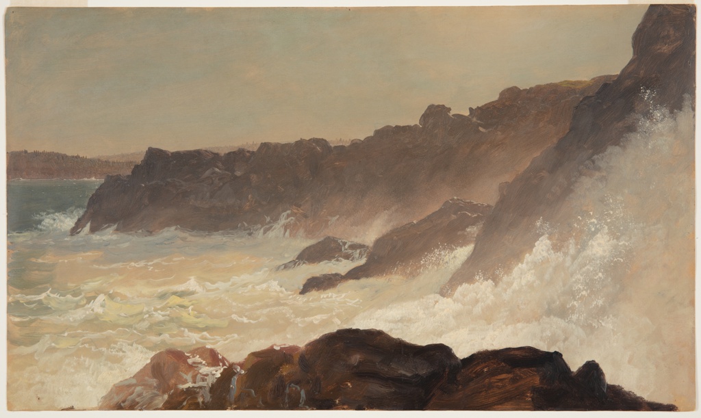 From his trip to Mount Desert Island during the Civil War, Church focused on the viewer’s direct confrontation with the roiling sea and its awesome power. This plein-air sketch executed on the spot was developed into a large painting exhibited in 1863 at the National Academy of Design. In the finished canvas, Church enhanced the sublime effects by adding the sun piercing through a pink and blue sky, perhaps alluding to the end of the Civil War through divine guidance. Reviewing the picture at the National Academy, one critic wrote, “Here is magnificent force in the sea…regarded as pure power; when it dies its final death in mad froth and vapor…we feel ourselves in an audacious actual presence, whose passion moves us almost like a fact of surf.” The painting was acquired by the New York railroad and steamship magnate Marshall Owen Roberts in 1863 to hang in his Fifth Avenue mansion along with his previously acquired Church pictures Mount Katahdin (1853) and Under Niagara (1862, now lost).