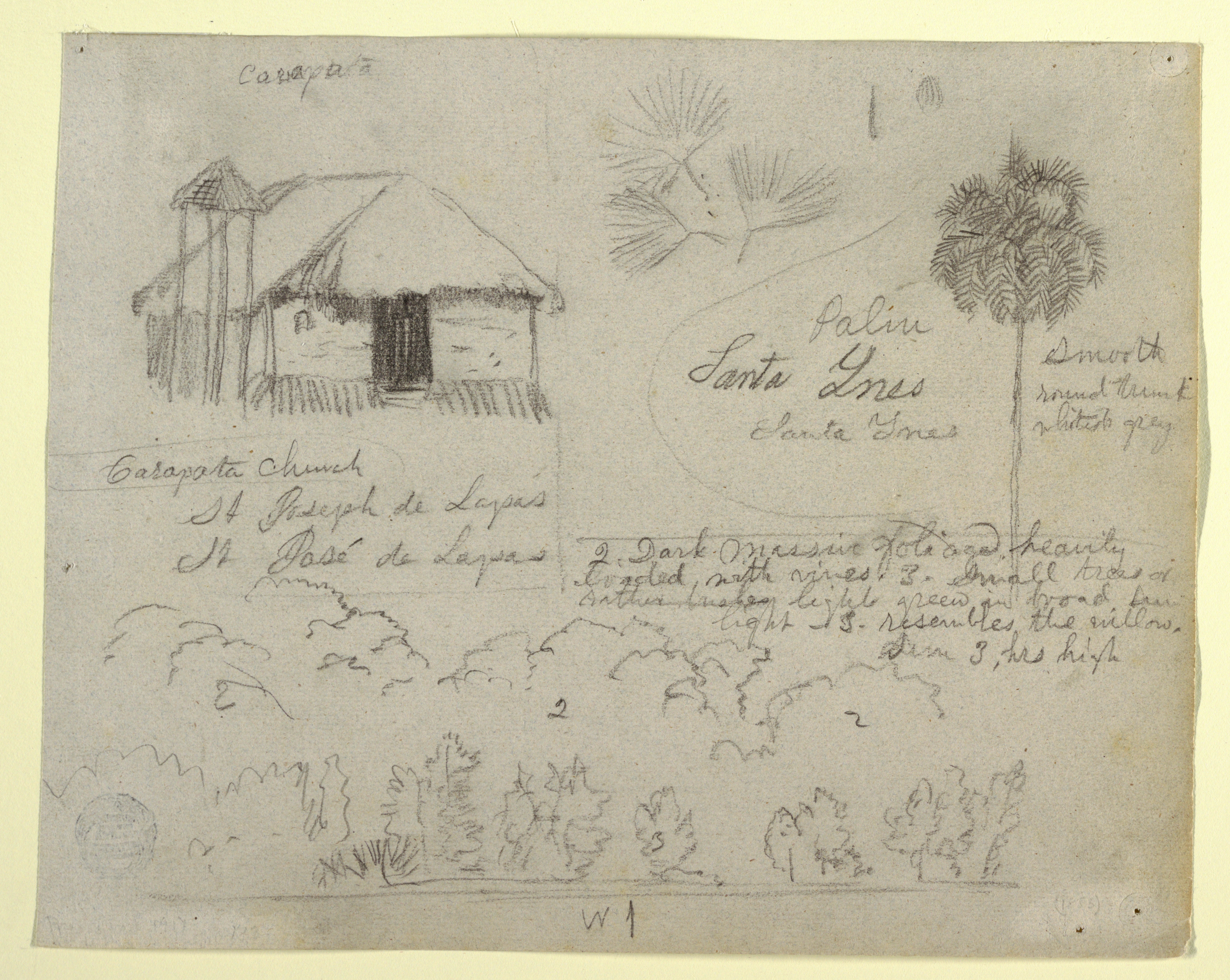 Inscribed: in graphite, upper left: Carapata; in graphite upper right: Palm / Santa Ynes / Sana Ynes / smooth / round trunk / whitish grey; in graphite, center left: Carapata Church / St Joseph de Lapas / St José de Lapas; in graphite, center right: 2 - Dark massive foliage heavily / loaded with vines 3 - small trees or / rather bushes light green in broad sun / light 3 - resembles the willow, / sun 3,hrs high; in graphite, lower center: 2 2 2 / 3 / W [arrow pointing up]