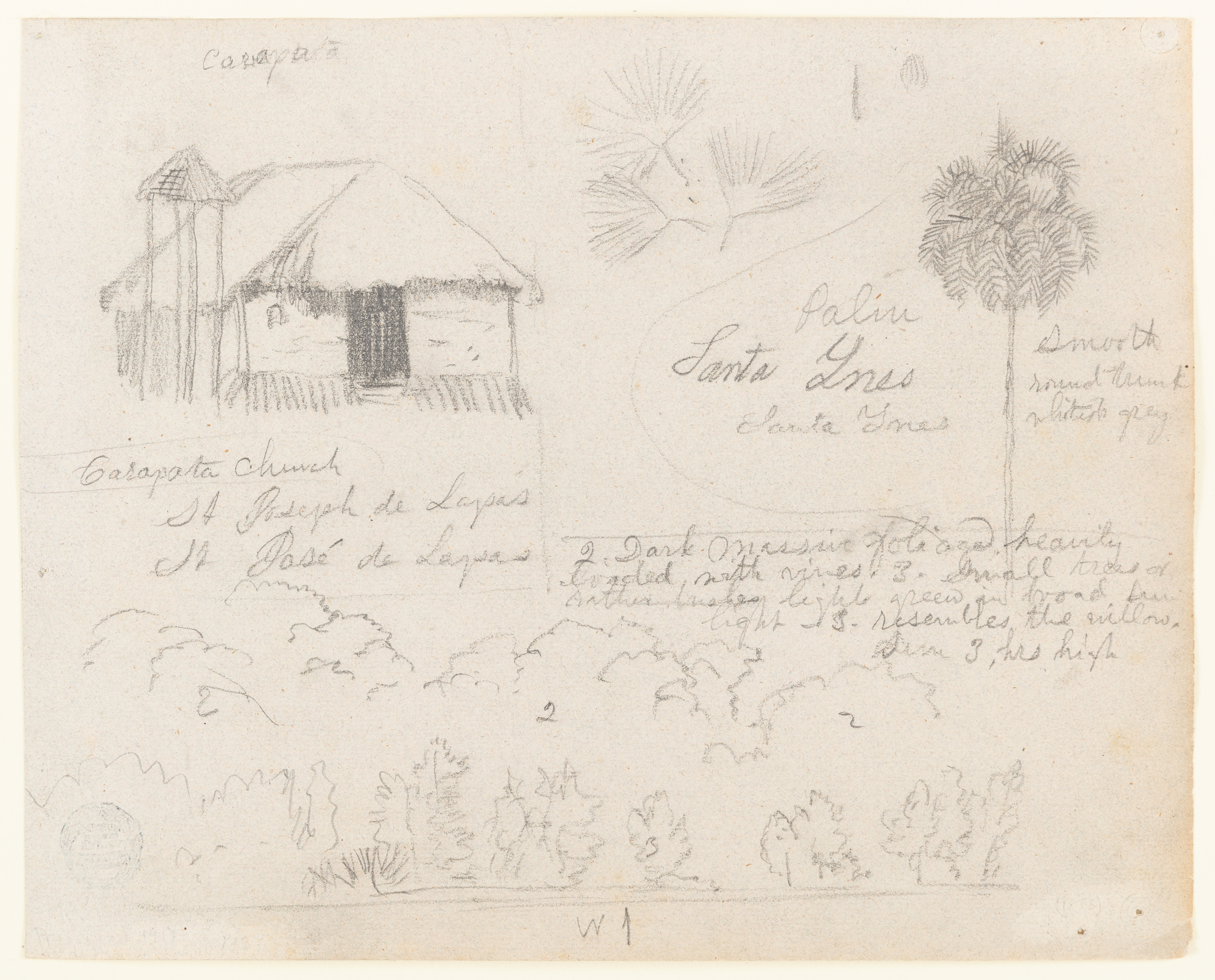 Inscribed: in graphite, upper left: Carapata; in graphite upper right: Palm / Santa Ynes / Sana Ynes / smooth / round trunk / whitish grey; in graphite, center left: Carapata Church / St Joseph de Lapas / St José de Lapas; in graphite, center right: 2 - Dark massive foliage heavily / loaded with vines 3 - small trees or / rather bushes light green in broad sun / light 3 - resembles the willow, / sun 3,hrs high; in graphite, lower center: 2 2 2 / 3 / W [arrow pointing up]