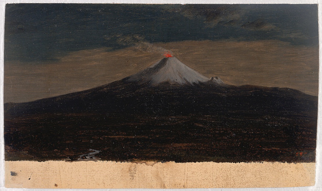 Drawing, Cotopaxi at Night, Viewed from the Hacienda San Agustin, Ecuador; Frederic Edwin Church (American, 1826–1900); USA; oil on tan paperboard mounted to aluminum support; 24.4 × 41.4 cm (9 5/8 × 16 5/16 in.); Gift of Louis P. Church; 1917-4-1332-a