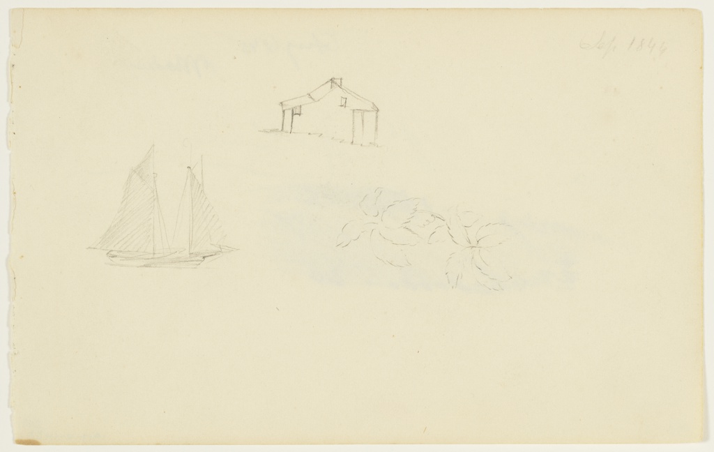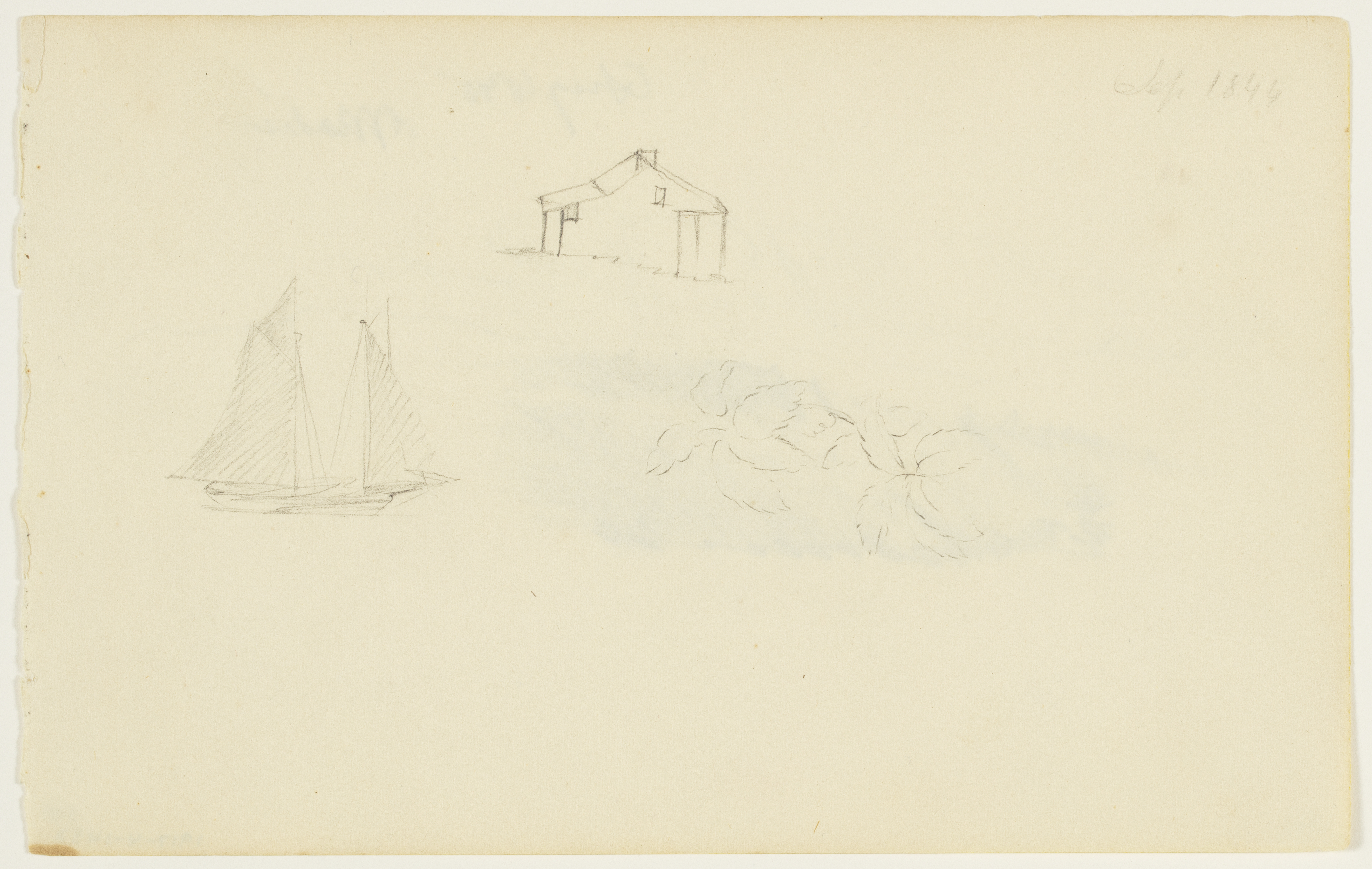 Drawing, Sailboat, House, and Plant; Frederic Edwin Church (American, 1826–1900); USA; graphite on white wove paper; verso: graphite; 11.9 × 18.8 cm (4 11/16 × 7 3/8 in.); Gift of Louis P. Church; 1917-4-1432
