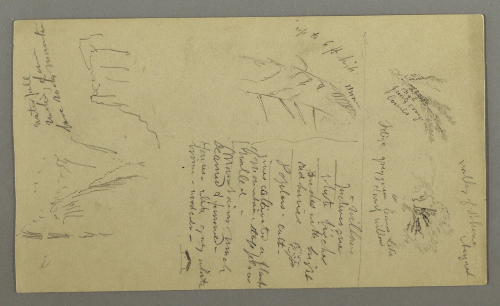 Inscribed: in graphite, upper right: Valley of Rhone / August; in graphite, upper left: rich / fruity orange / berries / Foliage grey green leaves like / dwarf willow; in graphite, center left: up to 6 ft hgh / Brown; in graphite, center right: Willows / picturesque / White birches / Bushes with bright / red berries / Poplars - cult - / vines cultivated on plants / of mountain. Steep places / walled / Mountains much / seamed and furrowed - / Houses - white grey white / brown - wood color -; in graphite, lower left: waterfull / washing down / bare rock mountain; in graphite, verso lower center: water; in graphite, verso lower right: - Saxon - / Bet. Vevey & Sion