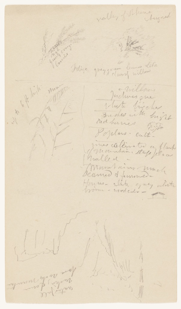 Inscribed: in graphite, upper right: Valley of Rhone / August; in graphite, upper left: rich / fruity orange / berries / Foliage grey green leaves like / dwarf willow; in graphite, center left: up to 6 ft hgh / Brown; in graphite, center right: Willows / picturesque / White birches / Bushes with bright / red berries / Poplars - cult - / vines cultivated on plants / of mountain. Steep places / walled / Mountains much / seamed and furrowed - / Houses - white grey white / brown - wood color -; in graphite, lower left: waterfull / washing down / bare rock mountain; in graphite, verso lower center: water; in graphite, verso lower right: - Saxon - / Bet. Vevey & Sion
