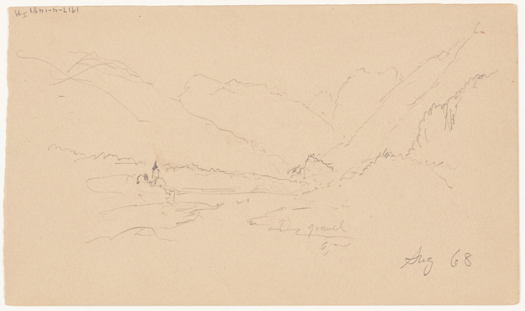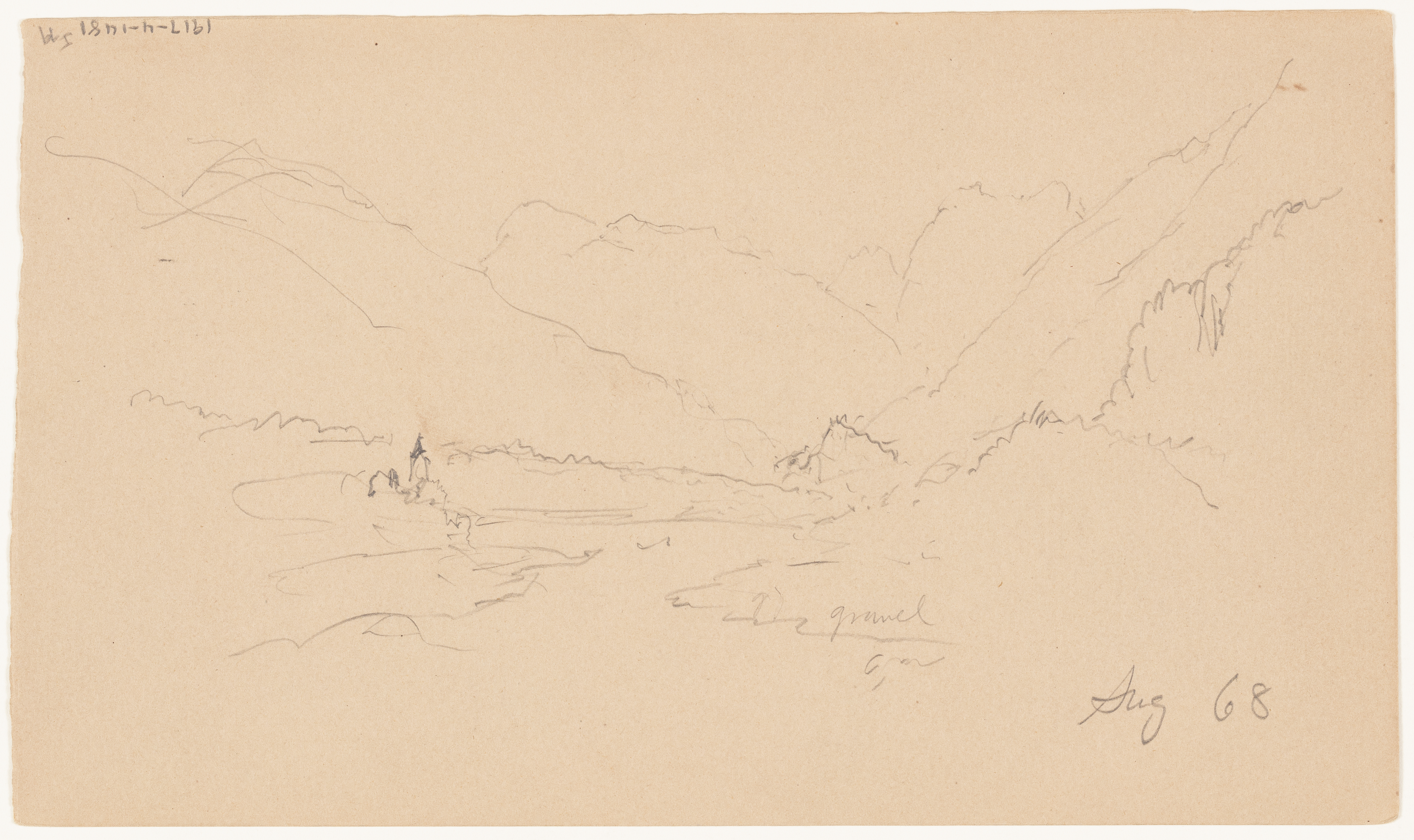 This is a Drawing. It was created by Frederic Edwin Church. It is dated August 1868 and we acquired it in 1917. Its medium is graphite and white gouache on tan laid paper; verso: graphite. It is a part of the Drawings, Prints, and Graphic Design department.