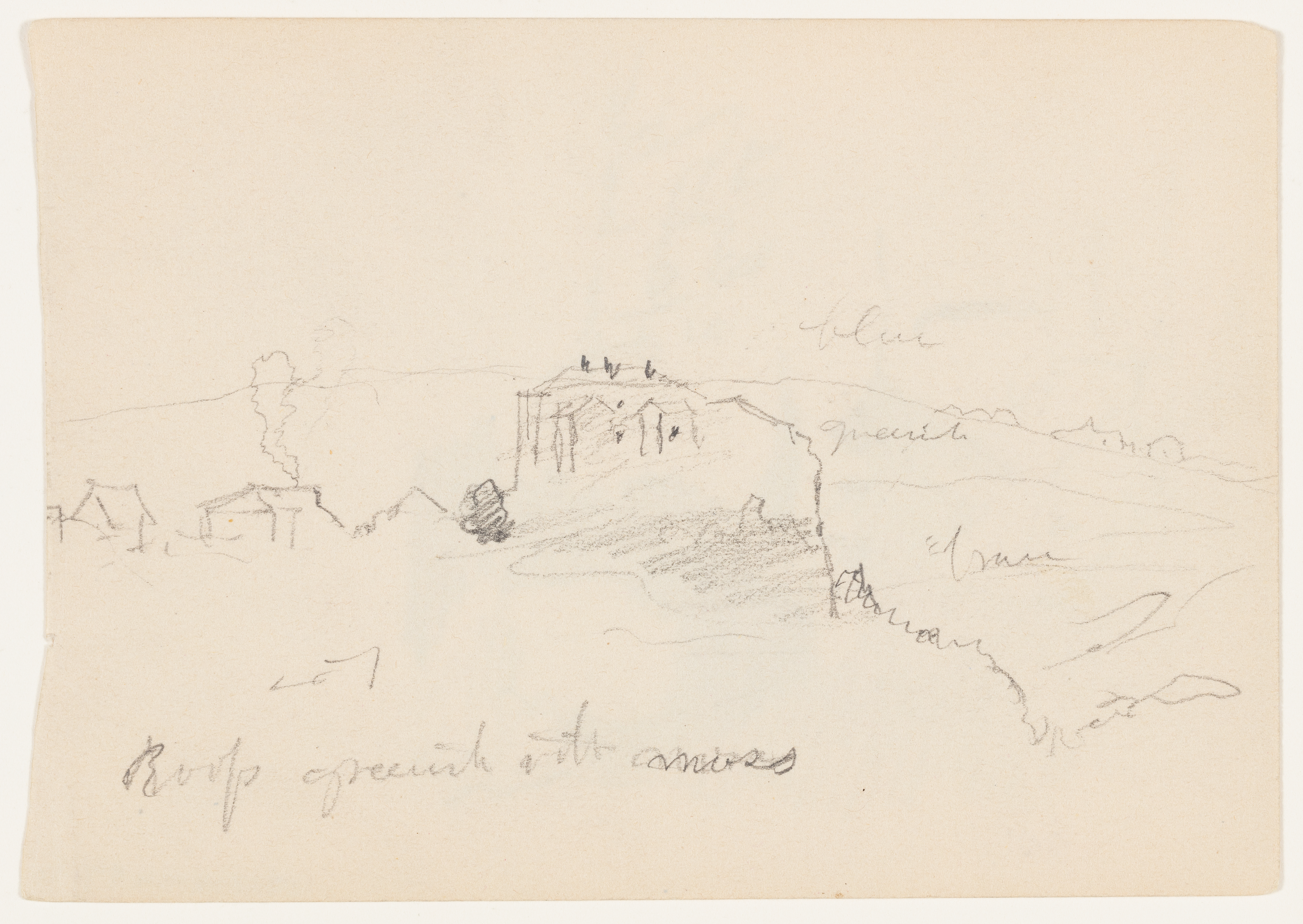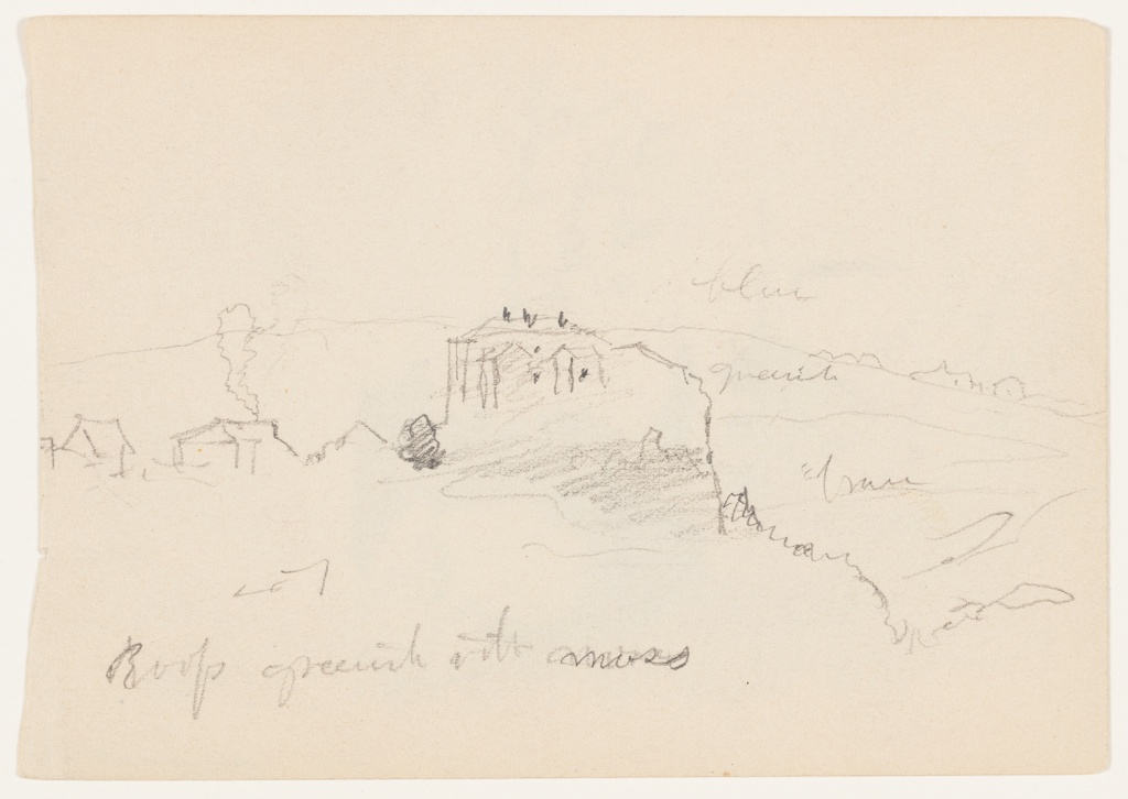 Inscribed: in graphite, center right: blue / greenish / brown; in graphite, lower left: Roof greenish with moss; in graphite, verso upper center: 2 / 2; in graphite, center: 2; in graphite, center right: 2 light / reflected / from water