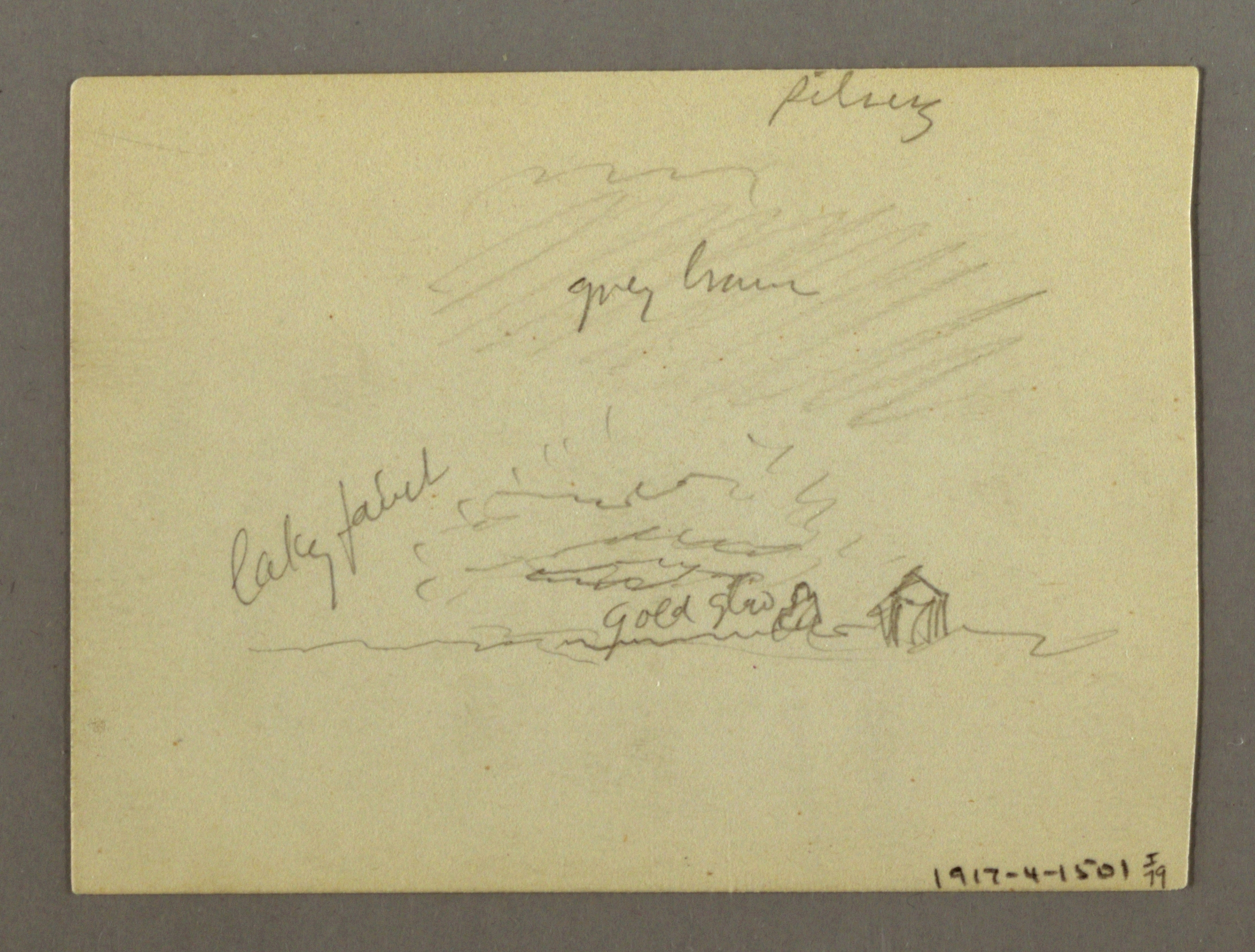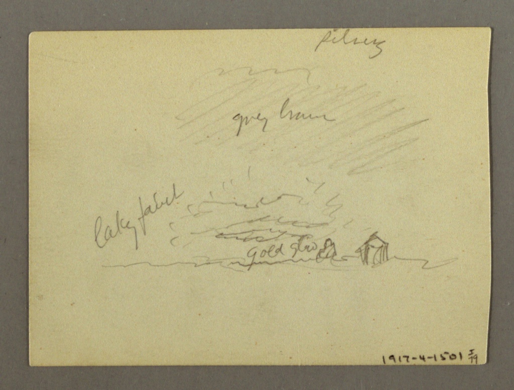 Inscribed: in graphite, upper left: smoky brown; in graphite, center left: blue very; in graphite, center: gold / rich edge; in graphite, lower center: 2; in graphite, lower right: 2 - gold or.; in graphite, verso upper center: silvery / grey brown; in graphite, verso center left: laky faint; in graphite, center: gold glow
