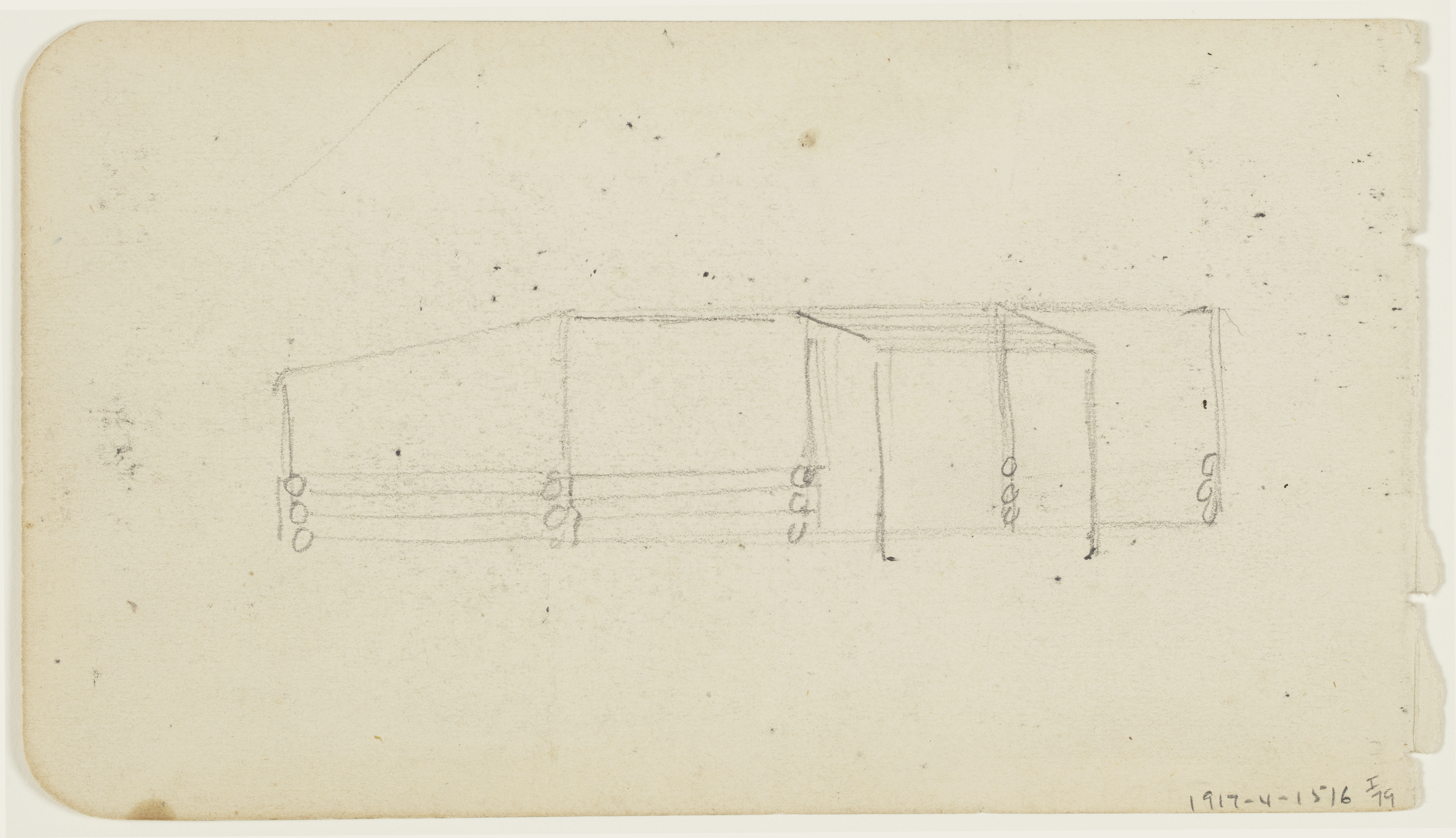 Drawing, Floorplan of a Cabin, Lake Millinocket, Maine; Frederic Edwin Church (American, 1826–1900); USA; graphite on white wove paper; verso: graphite; 10.2 × 18.1 cm (4 in. × 7 1/8 in.); Gift of Louis P. Church; 1917-4-1516