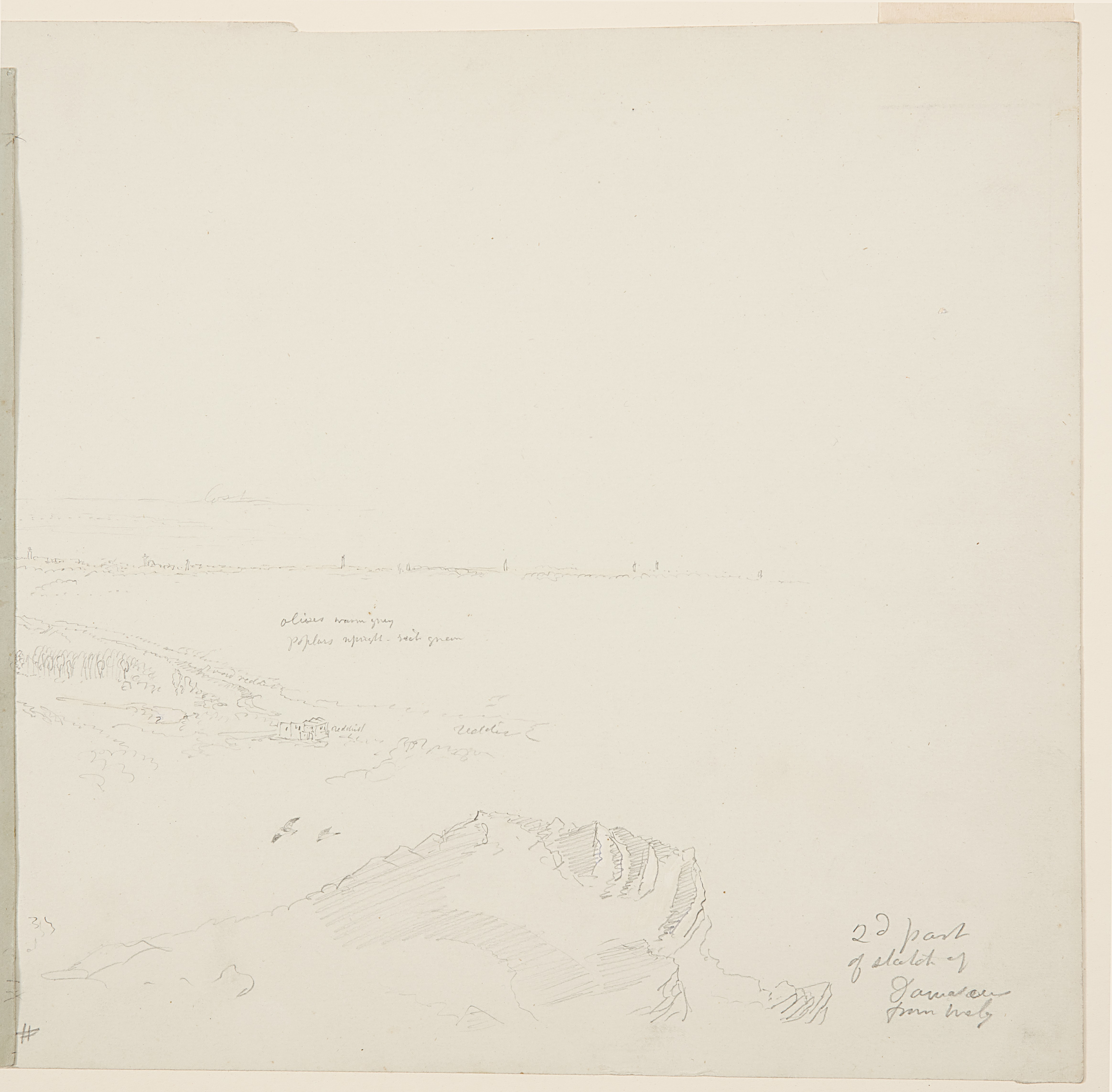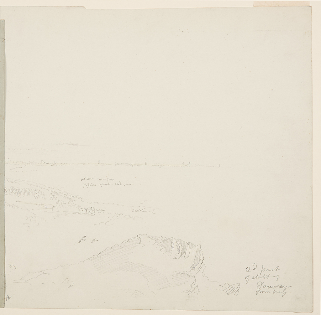 Inscribed in graphite, center: lost / olives warm grey / poplars upright - rich green / road reddish / reddish reddish; lower right: 2d part / of sketch of / Damascus / from wady