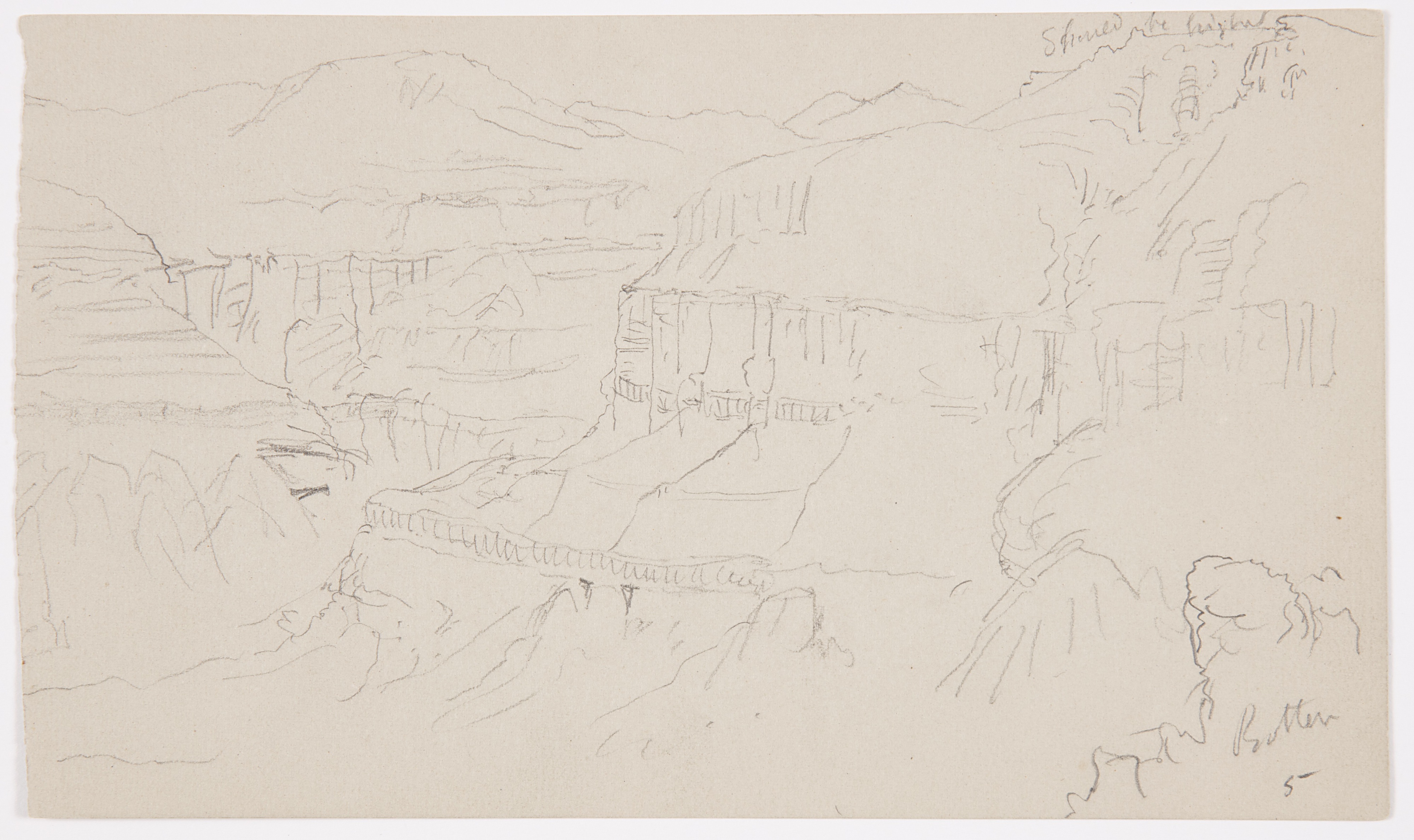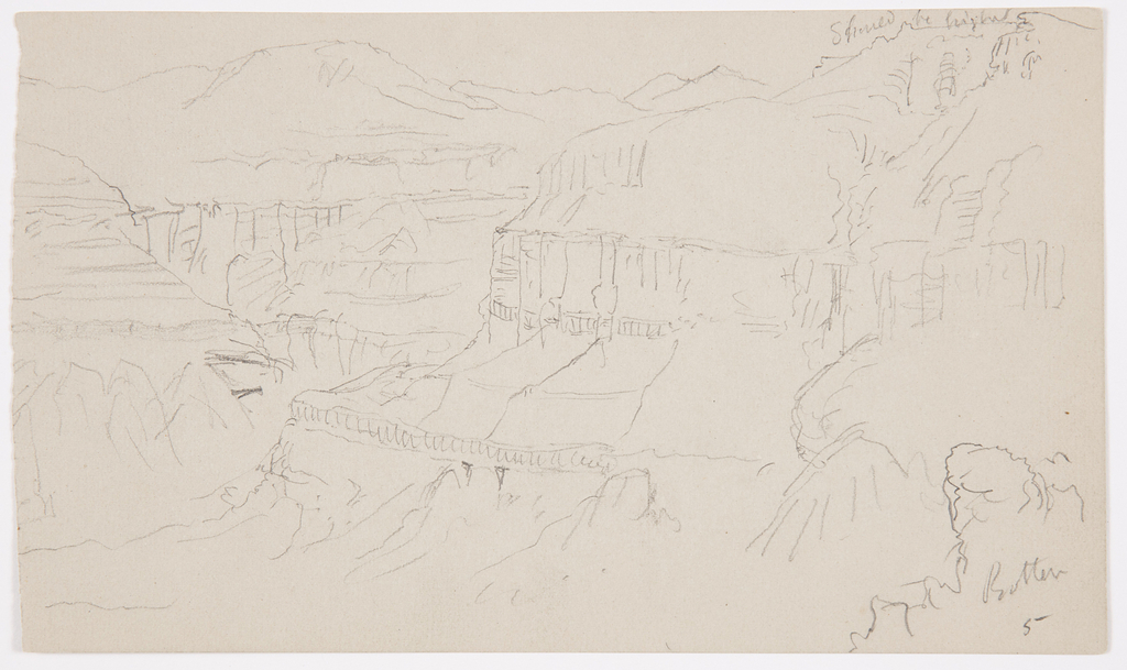 Inscribed in graphite, uppe right: Should be higher; lower right: Rotten / 5; verso upper center: general color gold brown / flint colored strata dove like grey on slopes / Whitish faces on perpendicular rocks - debris; center: greenish yel / white; lower left: El Yemen / see preceding / pages