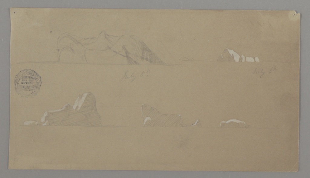 In the far North, Church encountered a landscape of water and ice. His sketches reveal a fascination with the varied forms of icebergs, shaped by the elements. Waves, currents, sunshine, and storms acted on each iceberg to produce unique surface patterns. Some icebergs revealed fresh fractures, sharply cut like broken porcelain. Others were rounded and polished by the weather.