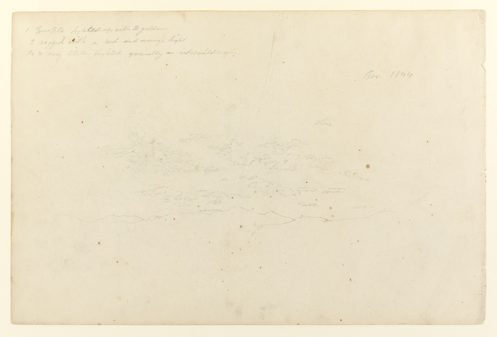 Inscribed: in graphite, upper left: 1 purple lighted up with 2 golden / 3 ragged with a red and orange light / No. 4 very little lighted generally an indescribable color; in graphite, upper right: Nov 1844; in graphite, center: blue / 4 4 / 3 3 / blue / 1 / 2 / 2 / warm; in graphite, verso lower right: July 1844