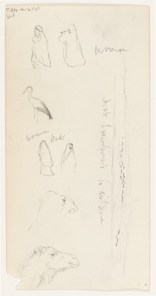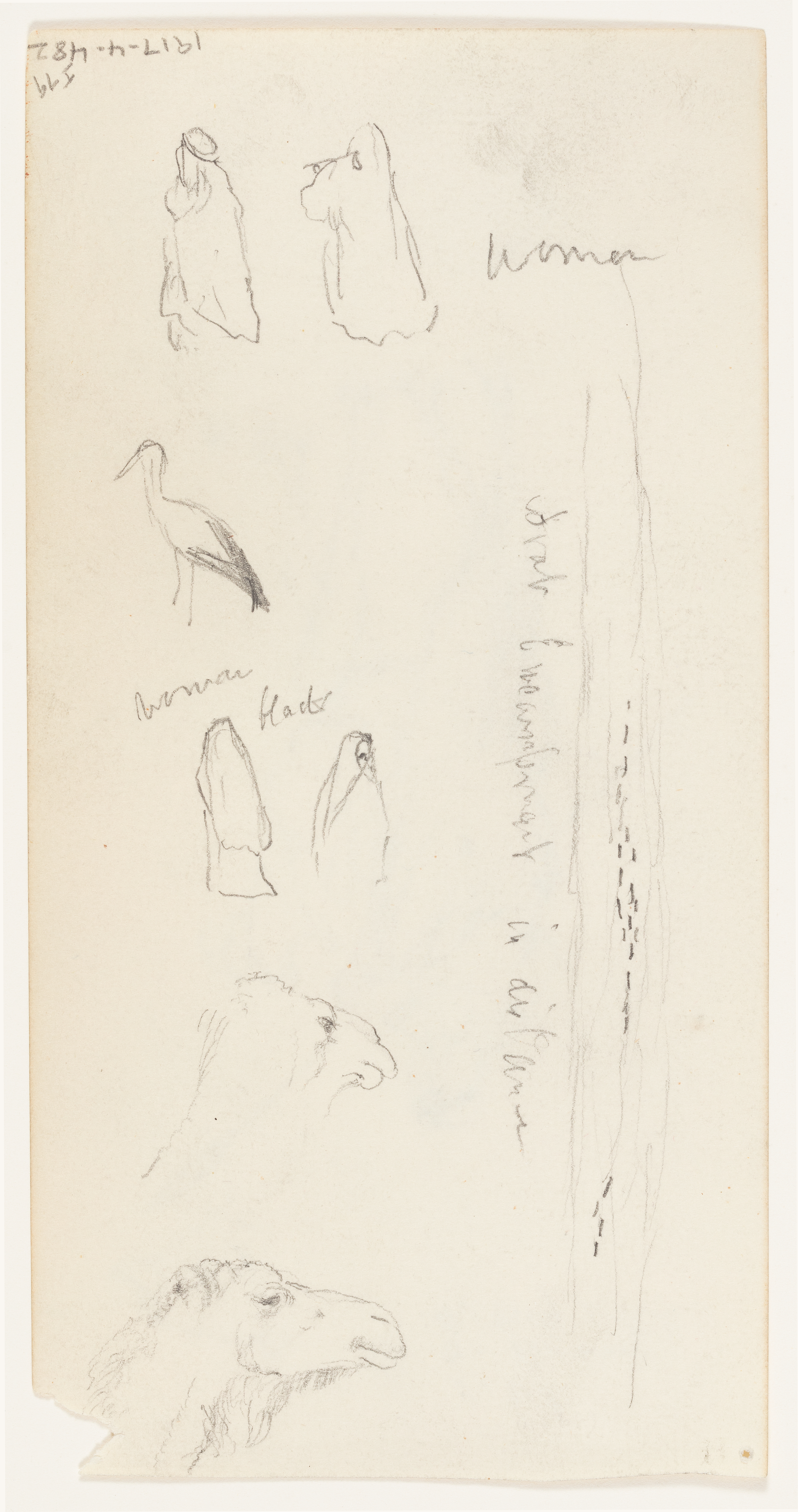 Inscribed: in graphite, upper right: 2 - red / 3 - Brown / 4 - Dirty white; in graphite, center: 4 / 3 / 2; in graphite, verso upper right: Women; in graphite, verso center: Woman / black; in graphite, verso right margin: Arab Encampment in distance