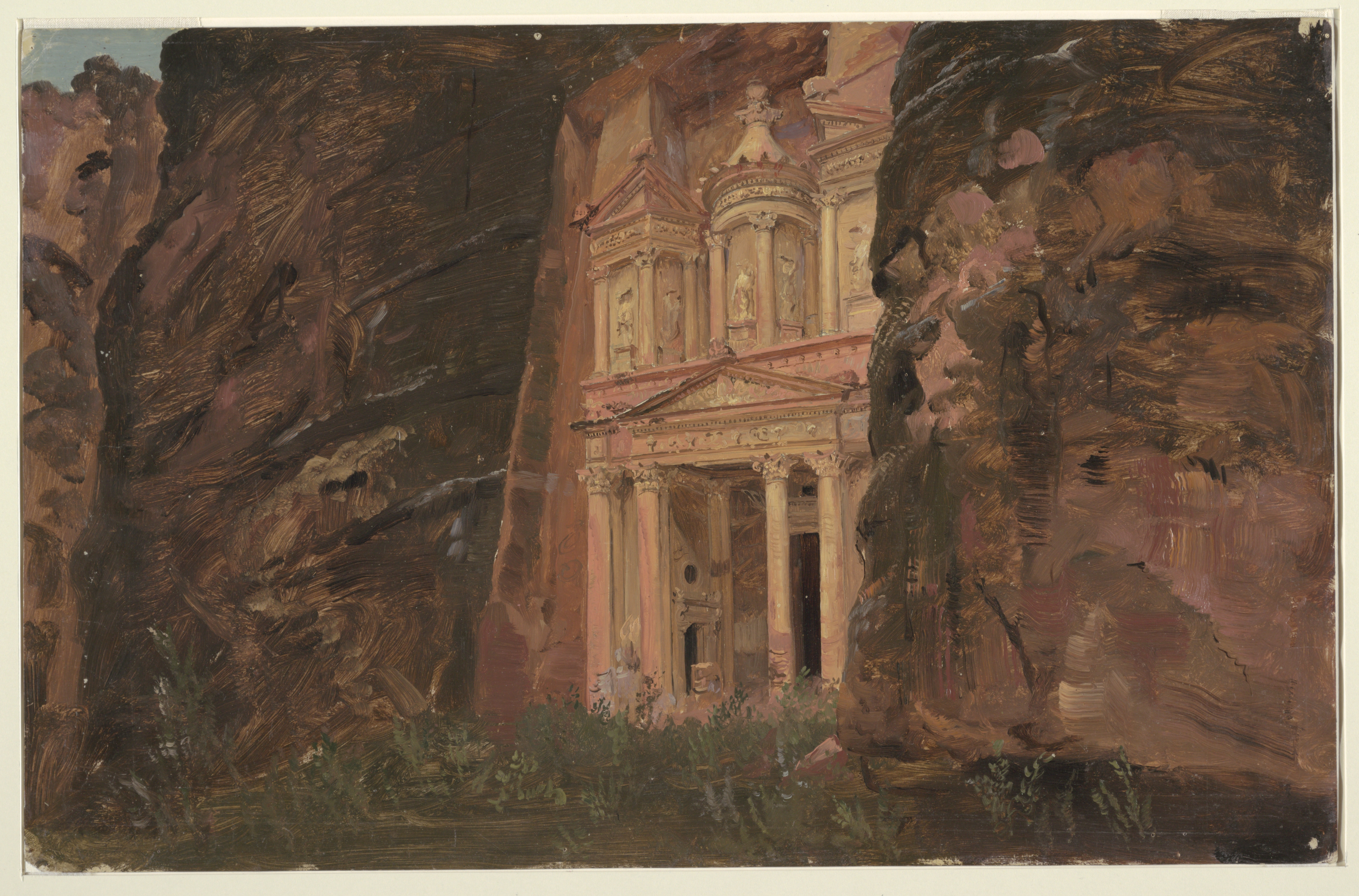 Drawing, Al-Khazneh, Petra; Frederic Edwin Church (American, 1826–1900); USA; oil and graphite on tan paperboard; 32.8 × 50.8 cm (12 15/16 × 20 in.); Gift of Louis P. Church; 1917-4-485-a