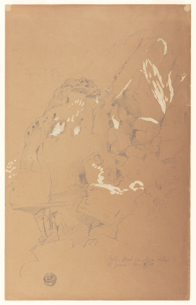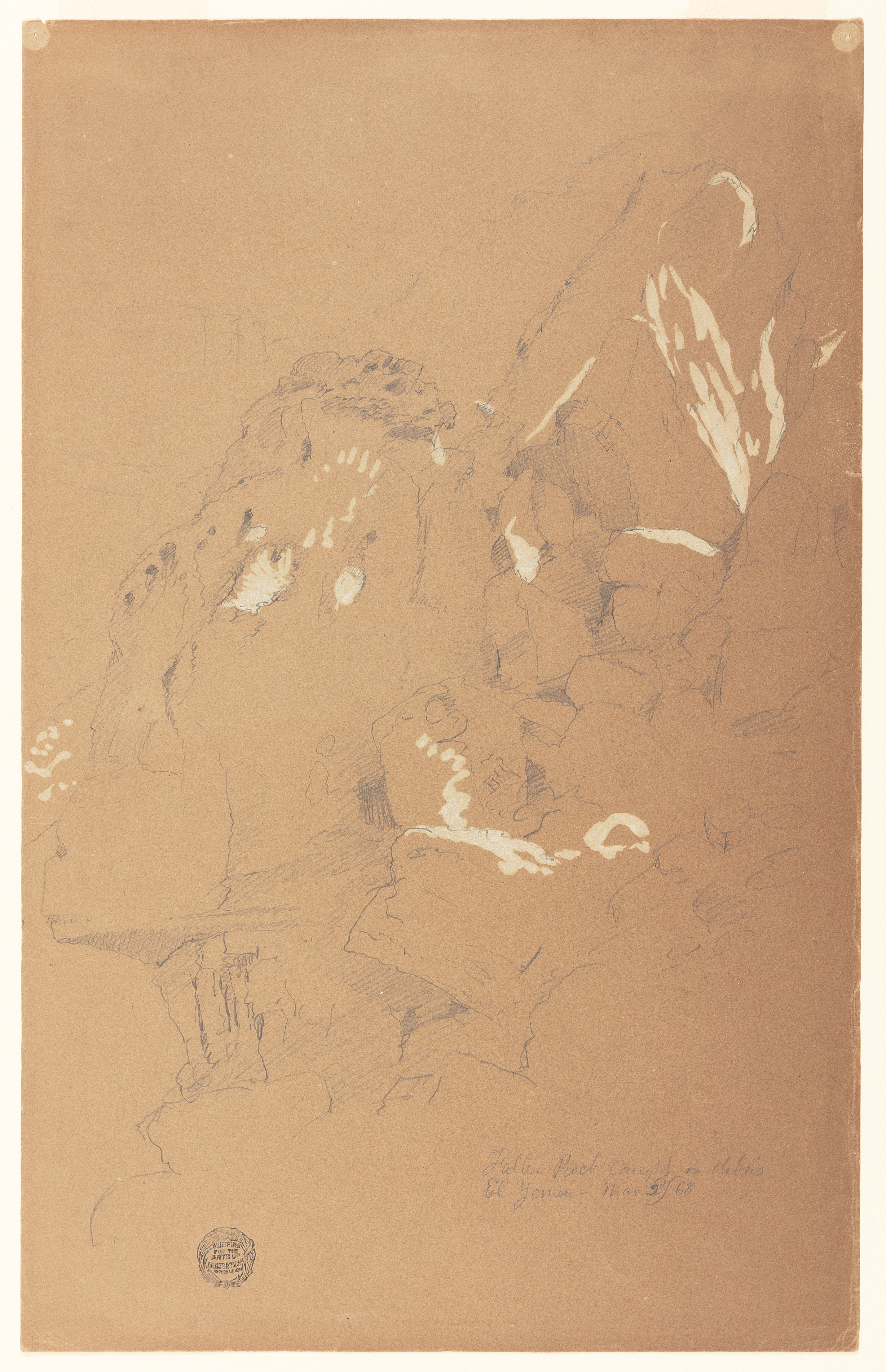 Drawing, Fallen Rock Caught on Debris, El Yemen Valley, Palestine (Israel); Frederic Edwin Church (American, 1826–1900); USA; graphite, brush and white gouache on brown wove paper; 44.1 × 27.6 cm (17 3/8 × 10 7/8 in.); Gift of Louis P. Church; 1917-4-491