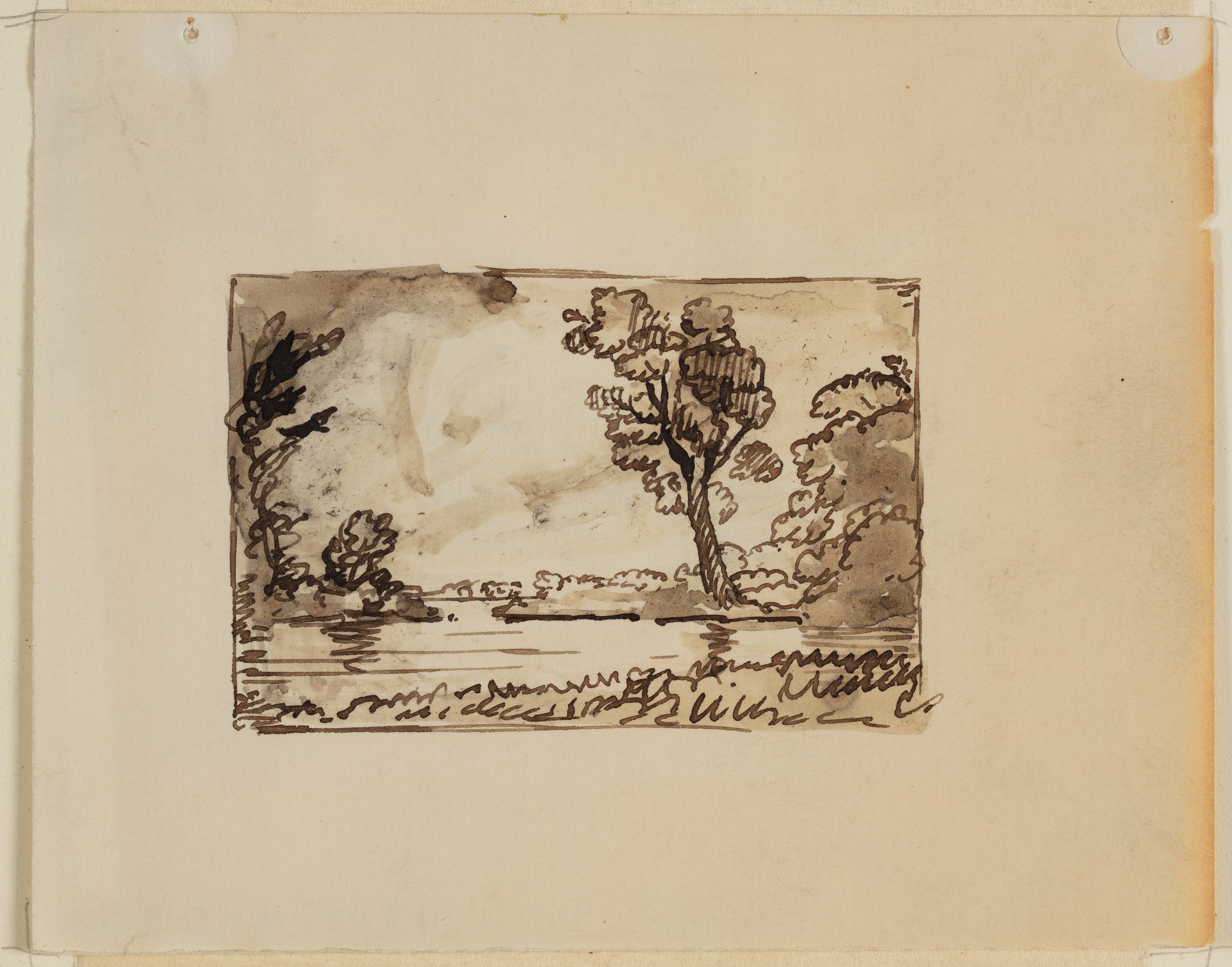 Drawing, Imaginary Landscape with View of a Lake; Frederic Edwin Church (American, 1826–1900); Attributed to Thomas Cole (1801 – 1848); USA; pen and dark brown ink on off-white laid paper; 9 × 11.2 cm (3 9/16 × 4 7/16 in.); Gift of Louis P. Church; 1917-4-536