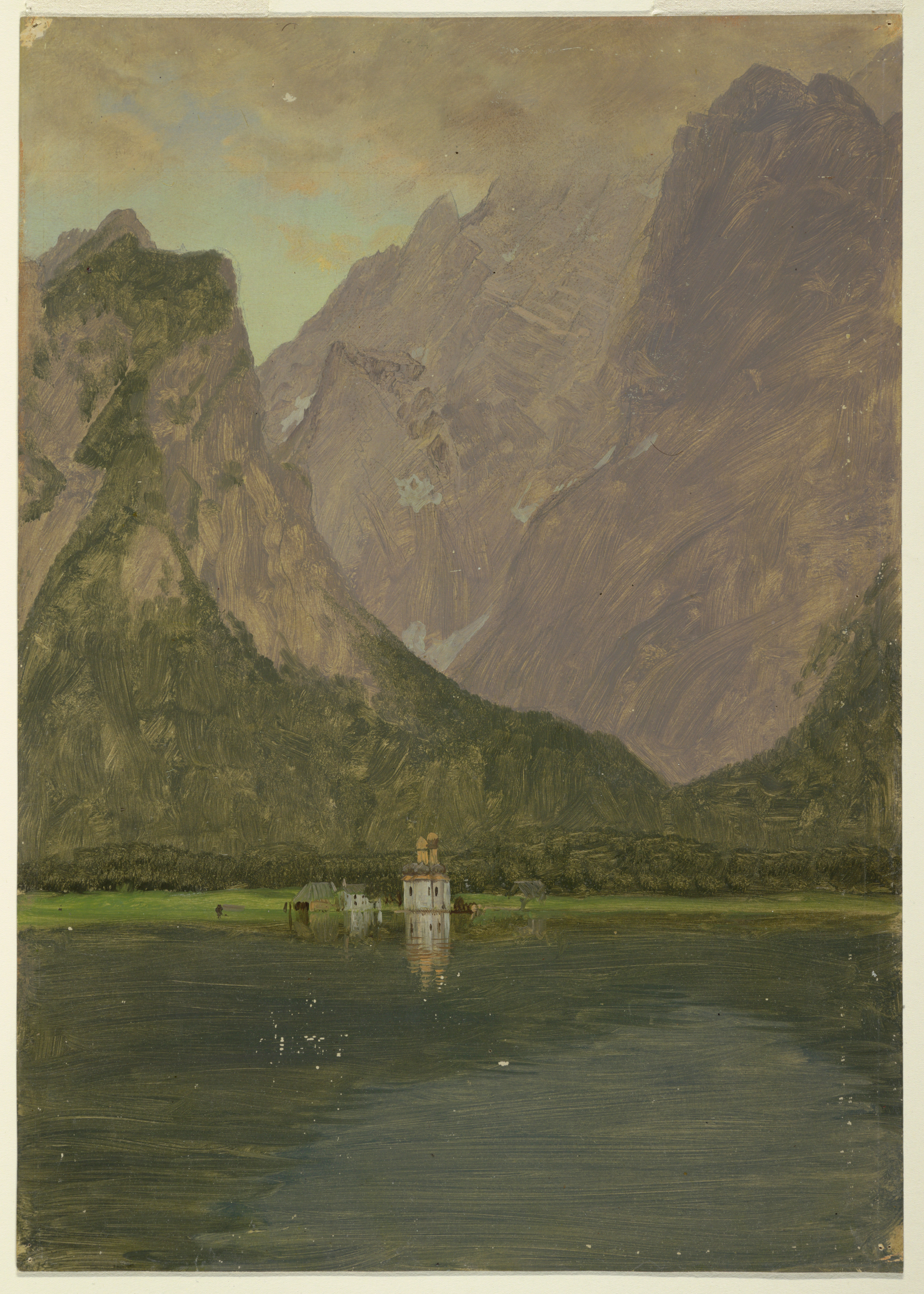 Drawing, St. Bartholomä on the Königssee, Bavaria (Germany); Frederic Edwin Church (American, 1826–1900); USA; oil paint and graphite on tan paperboard; 46.4 × 32.6 cm (18 1/4 × 12 13/16 in.); Gift of Louis P. Church; 1917-4-569-a