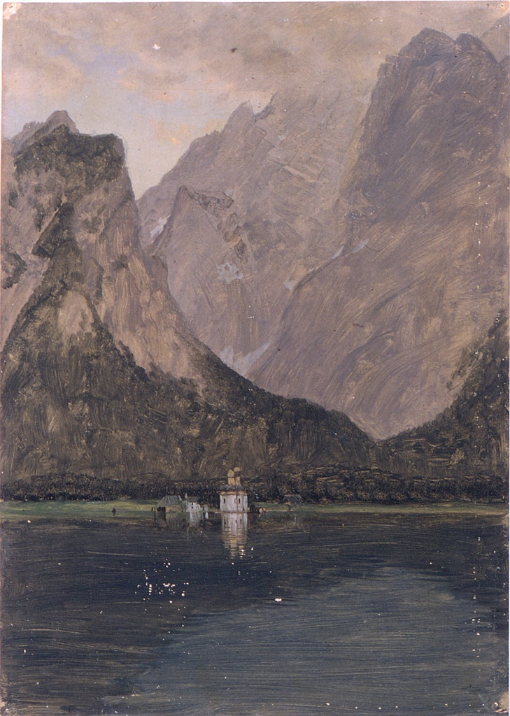 Drawing, St. Bartholomä on the Königssee, Bavaria (Germany); Frederic Edwin Church (American, 1826–1900); USA; oil paint and graphite on tan paperboard; 46.4 × 32.6 cm (18 1/4 × 12 13/16 in.); Gift of Louis P. Church; 1917-4-569-a
