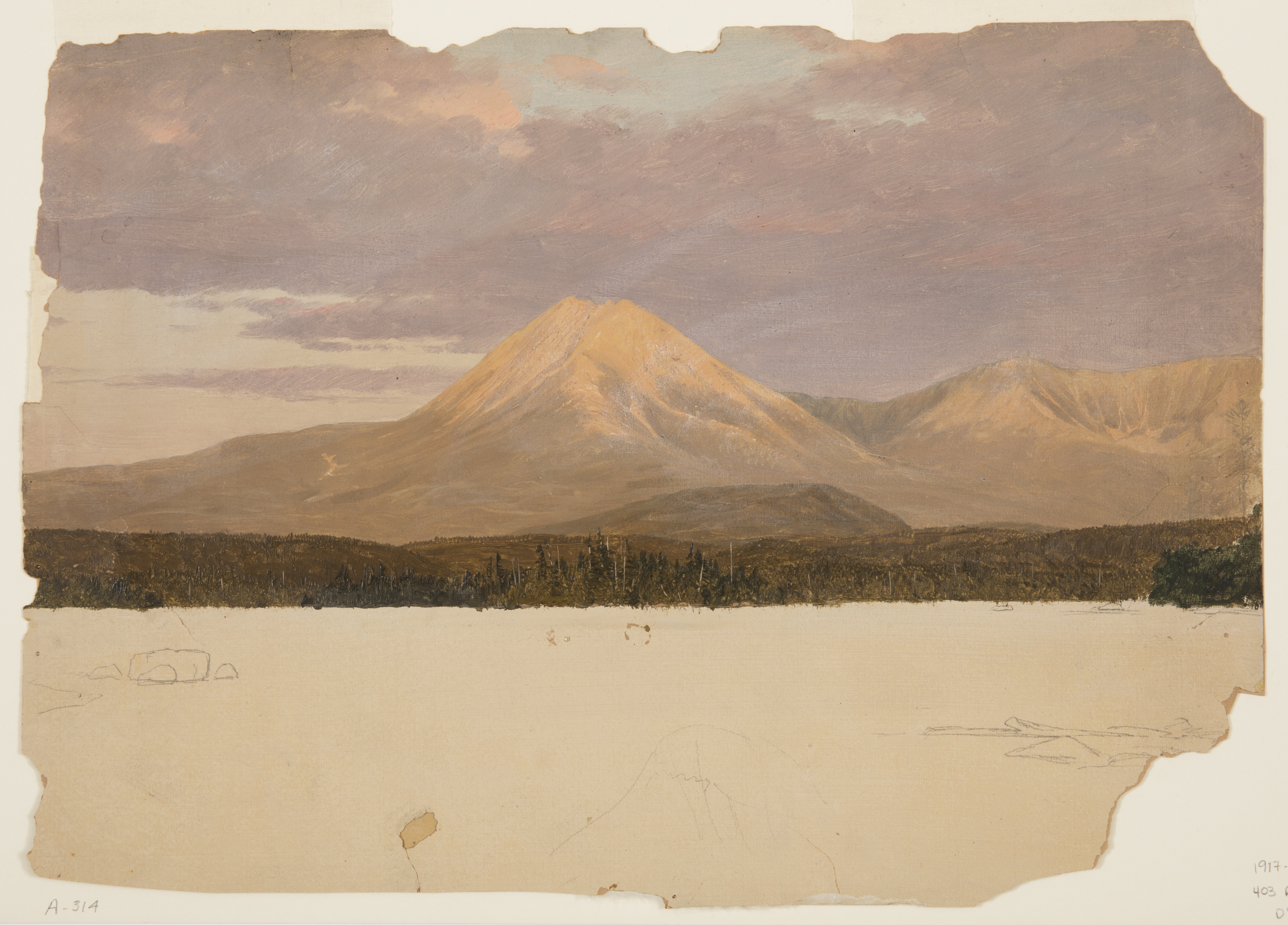 Drawing, Mt. Katahdin from Lake Katahdin; Frederic Edwin Church (American, 1826–1900); USA; oil and graphite on paperboard; 31.6 × 44.2 cm (12 7/16 × 17 7/16 in.); Gift of Louis P. Church; 1917-4-624