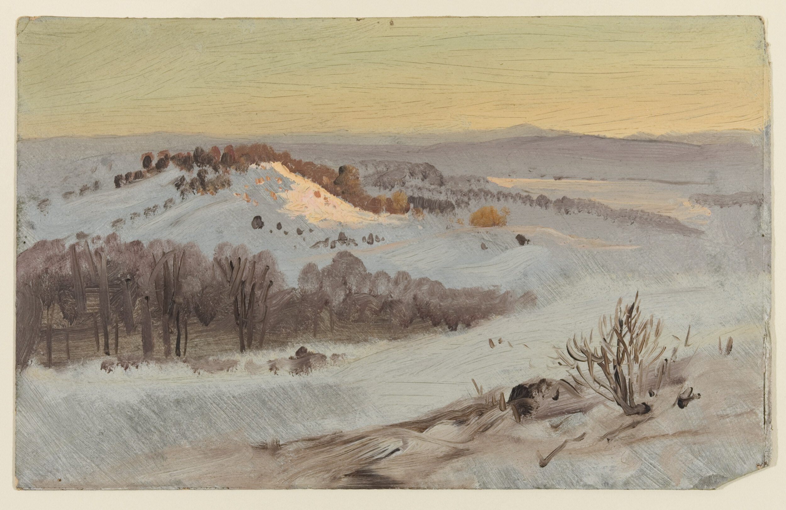 Drawing, Hudson Valley in Winter from Church's Farm, New York; Frederic Edwin Church (American, 1826–1900); USA; brush and oil, graphite on paperboard; 17.2 × 27.3 cm (6 3/4 × 10 3/4 in.); Gift of Louis P. Church; 1917-4-661