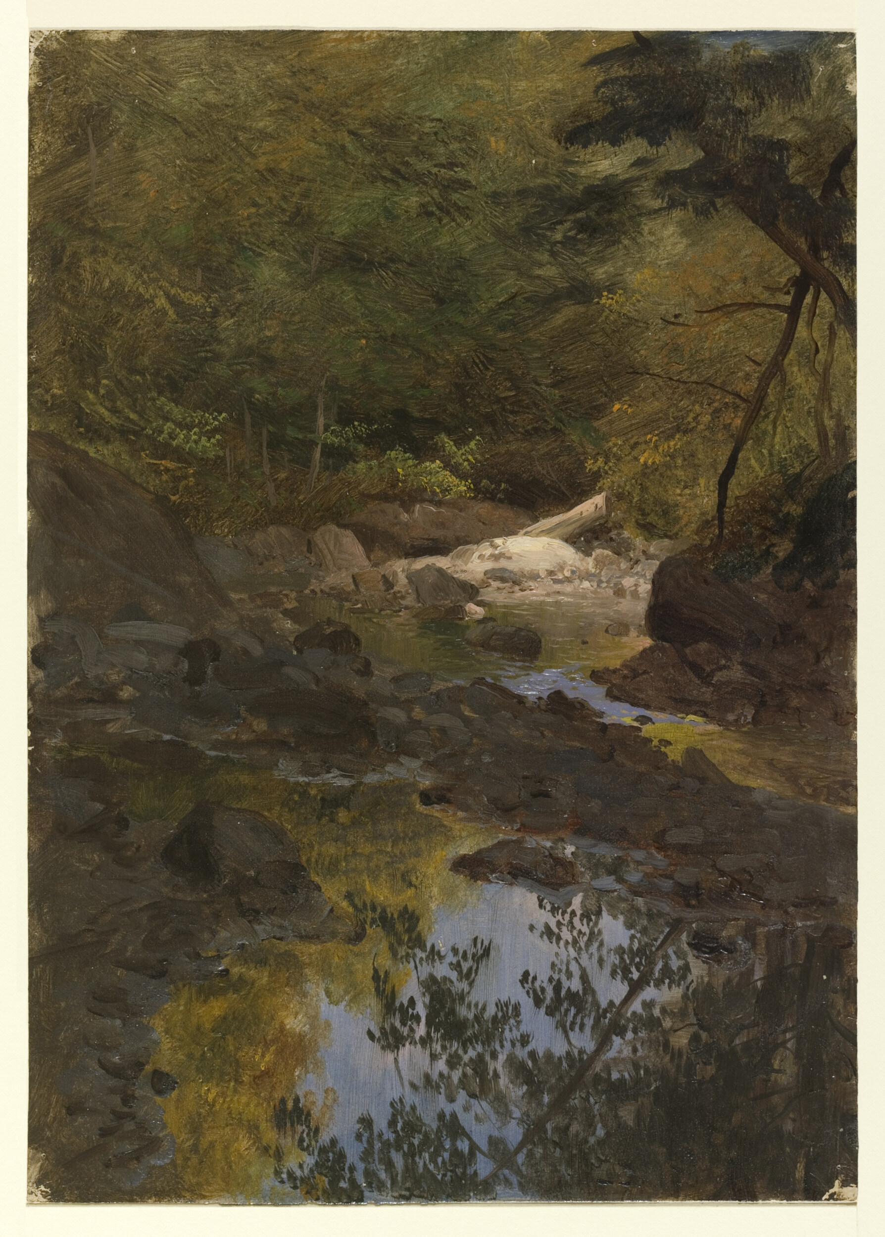 Drawing, Woodland Stream; Frederic Edwin Church (American, 1826–1900); USA; oil and graphite on tan paperboard; 32.7 × 23.3 cm (12 7/8 × 9 3/16 in.); Gift of Louis P. Church; 1917-4-664-a
