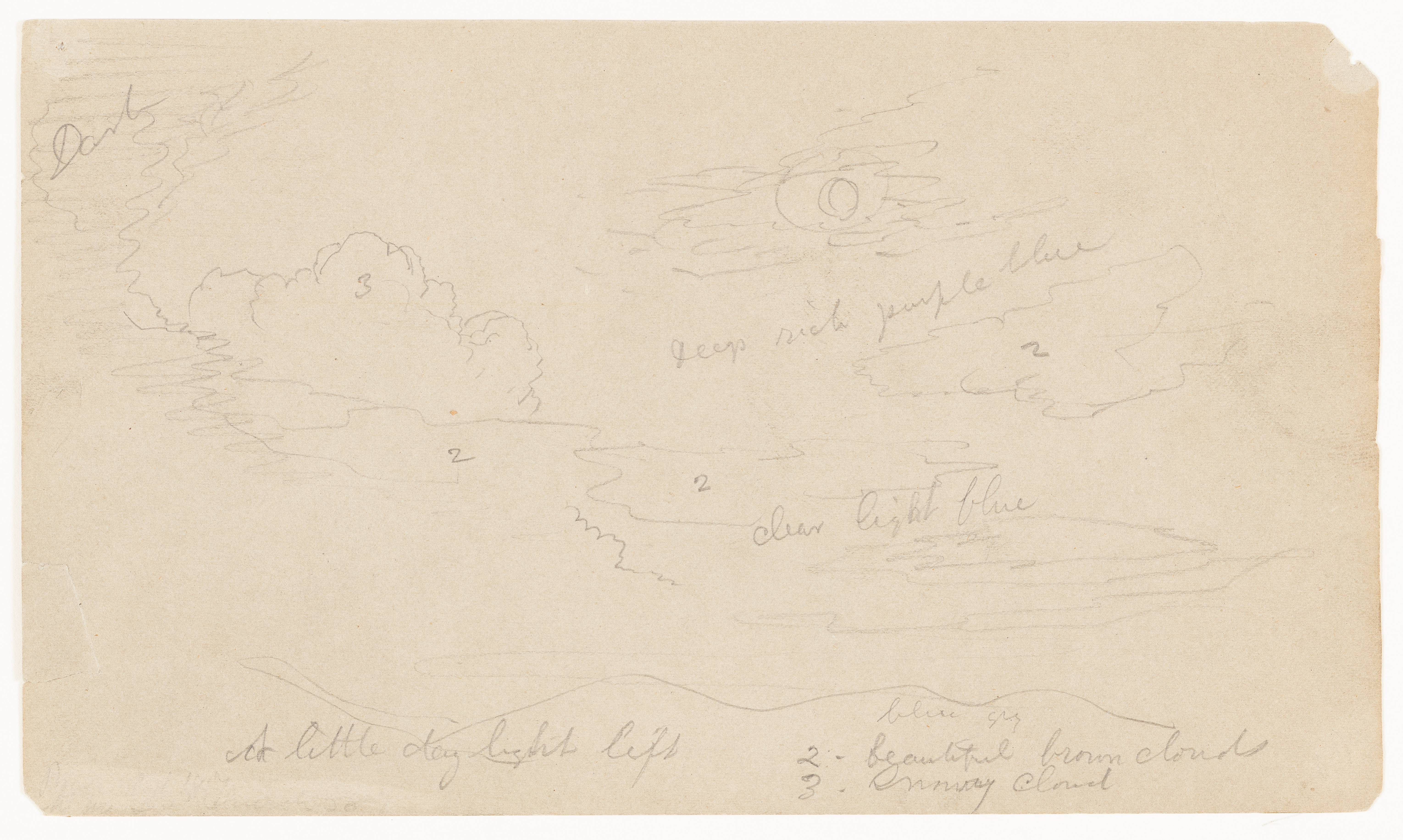 Inscribed: in graphite, upper left: Dark; in graphite, center left: 3 / 2; in graphite, center: Deep rich purple blue / 2 / 2 / clear light blue; in graphite, lower left: A little day light left; in graphite, lower right: blue sky / 2 - beautiful brown clouds / 3 - sunny cloud; in graphite, verso upper center: White Rose / gold center / small leaf -; in graphite, verso center: Foot long / deep green