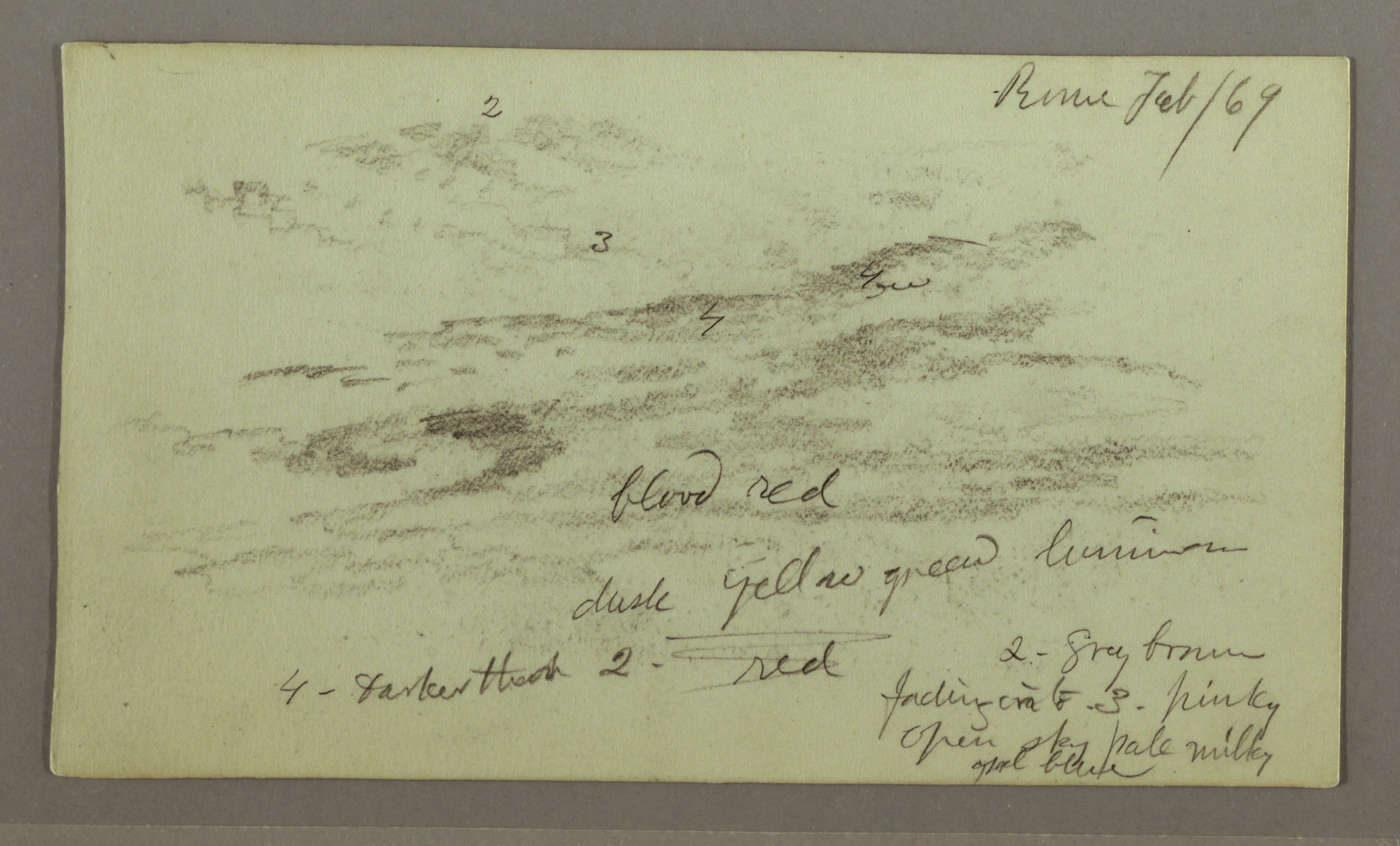 Inscribed: in graphite, upper center: 2 / 3; in graphite, upper right: Rome Feb /69; in graphite, center: 4 4 / blood red; in graphite, lower center: dusk yellow green luminous / Darker than 2 - red; in graphite, lower right: 2 - grey brown / fading into 3 - pinky / open sky pale milky / opal blue; in graphite, verso center: 4 / 2 3; in graphite, verso lower center: 2 window reflecting rich sky (orange) / 3 - sky delicate greenish blue with / faint warm streaks / 4 - End of building faint pinky
