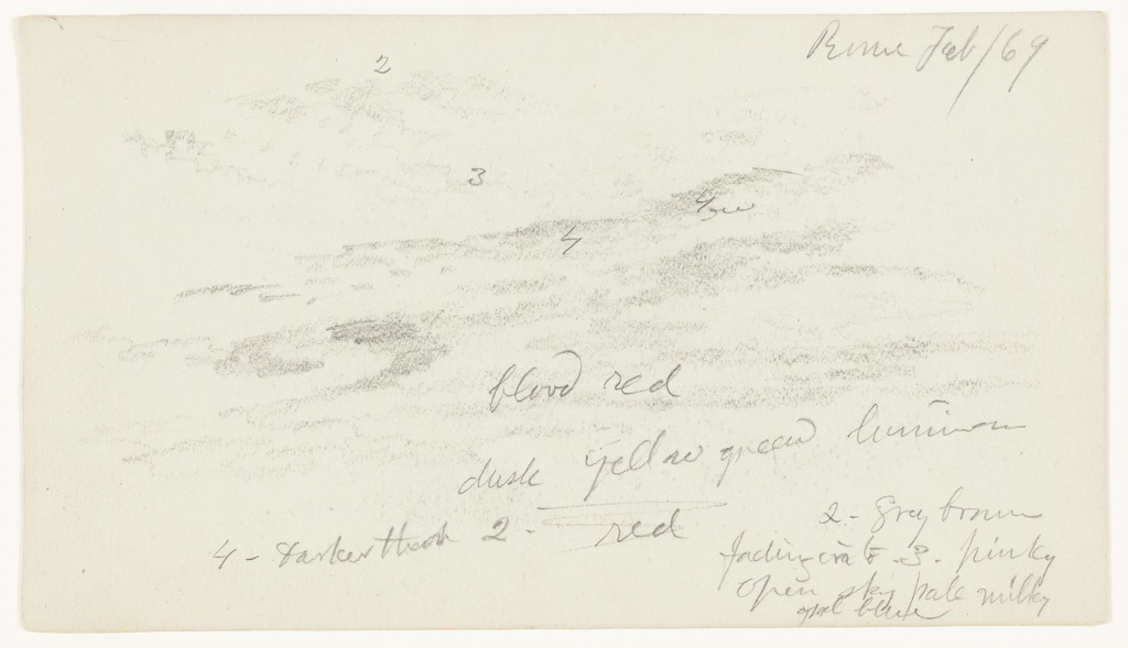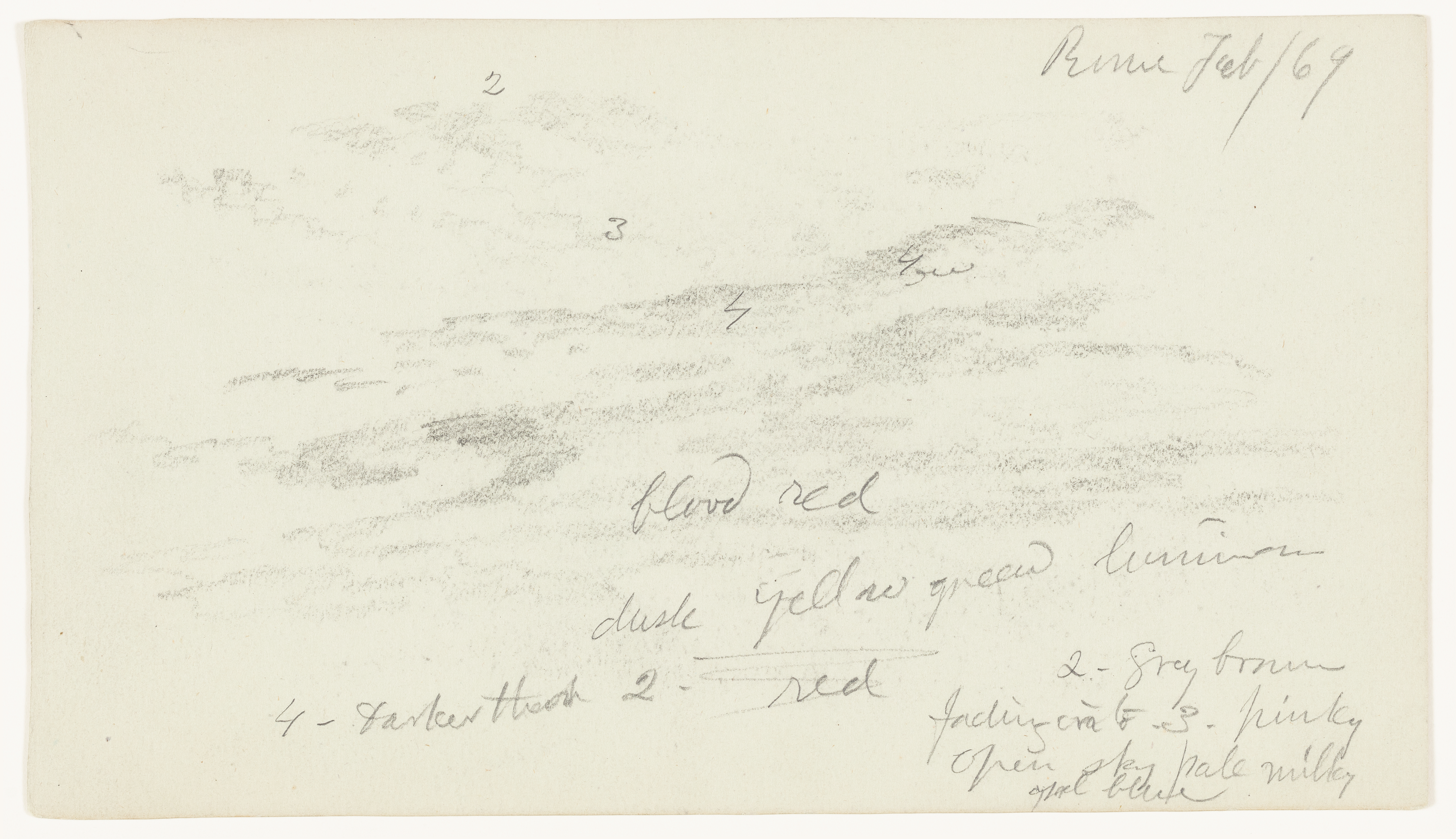 Inscribed: in graphite, upper center: 2 / 3; in graphite, upper right: Rome Feb /69; in graphite, center: 4 4 / blood red; in graphite, lower center: dusk yellow green luminous / Darker than 2 - red; in graphite, lower right: 2 - grey brown / fading into 3 - pinky / open sky pale milky / opal blue; in graphite, verso center: 4 / 2 3; in graphite, verso lower center: 2 window reflecting rich sky (orange) / 3 - sky delicate greenish blue with / faint warm streaks / 4 - End of building faint pinky
