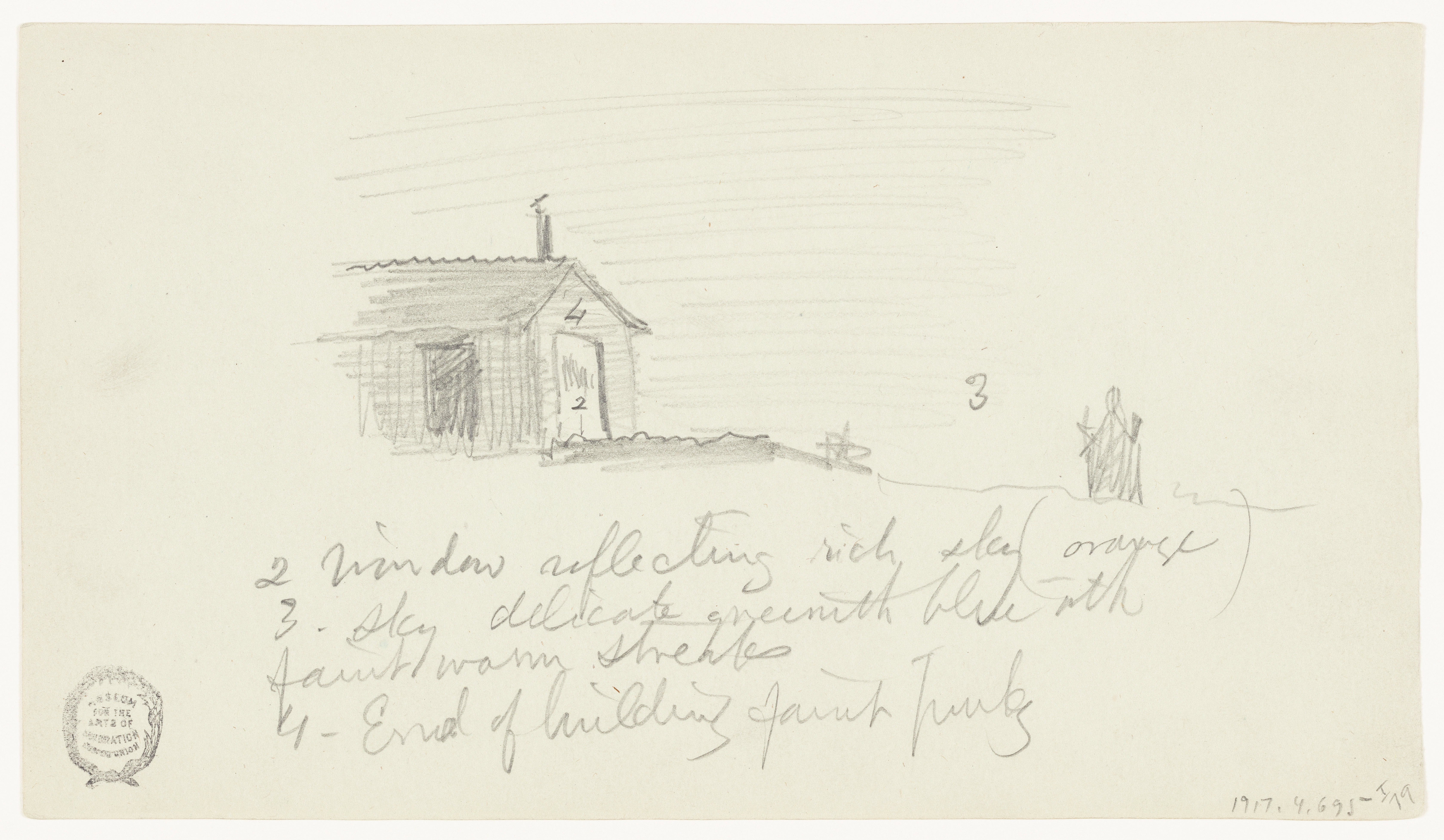 Inscribed: in graphite, upper center: 2 / 3; in graphite, upper right: Rome Feb /69; in graphite, center: 4 4 / blood red; in graphite, lower center: dusk yellow green luminous / Darker than 2 - red; in graphite, lower right: 2 - grey brown / fading into 3 - pinky / open sky pale milky / opal blue; in graphite, verso center: 4 / 2 3; in graphite, verso lower center: 2 window reflecting rich sky (orange) / 3 - sky delicate greenish blue with / faint warm streaks / 4 - End of building faint pinky