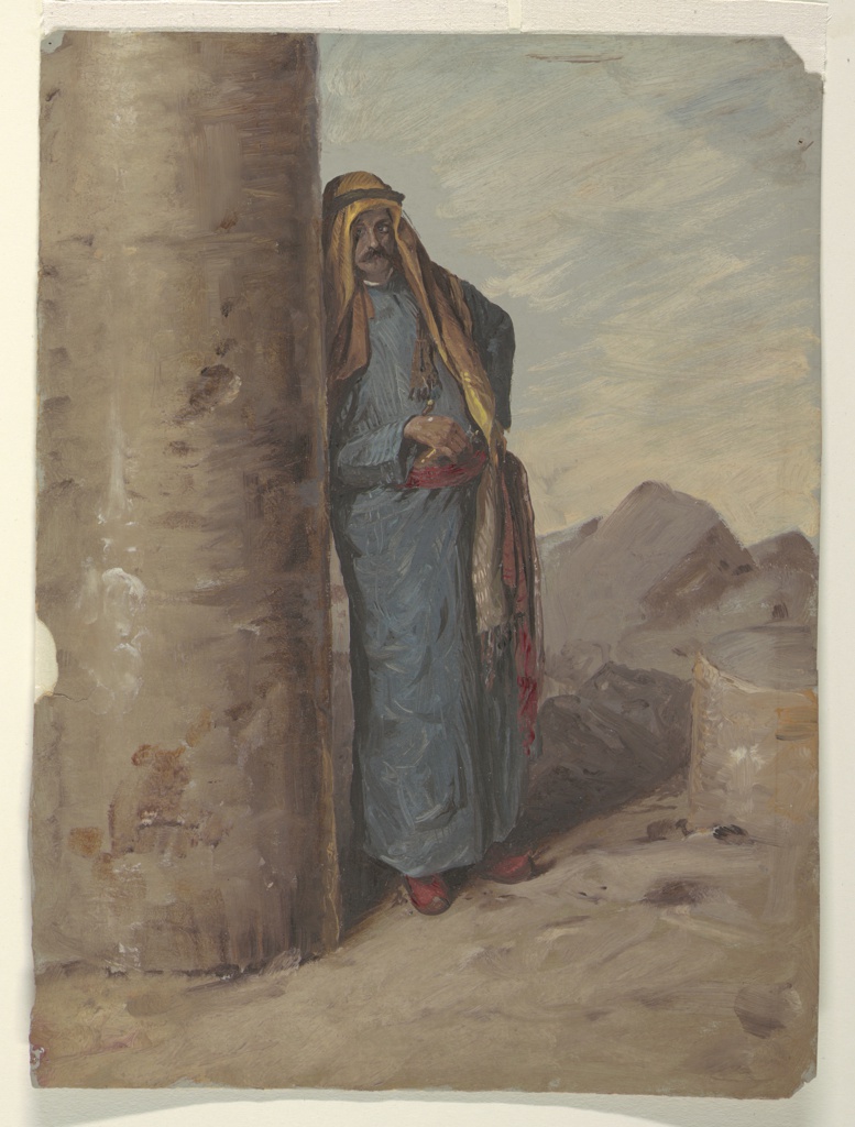 Drawing, Standing Bedouin Figure; Frederic Edwin Church (American, 1826–1900); USA; oil paint and graphite on brown paper; verso: black crayon; 35.3 × 26.9 cm (13 7/8 × 10 9/16 in.); Gift of Louis P. Church; 1917-4-752-c