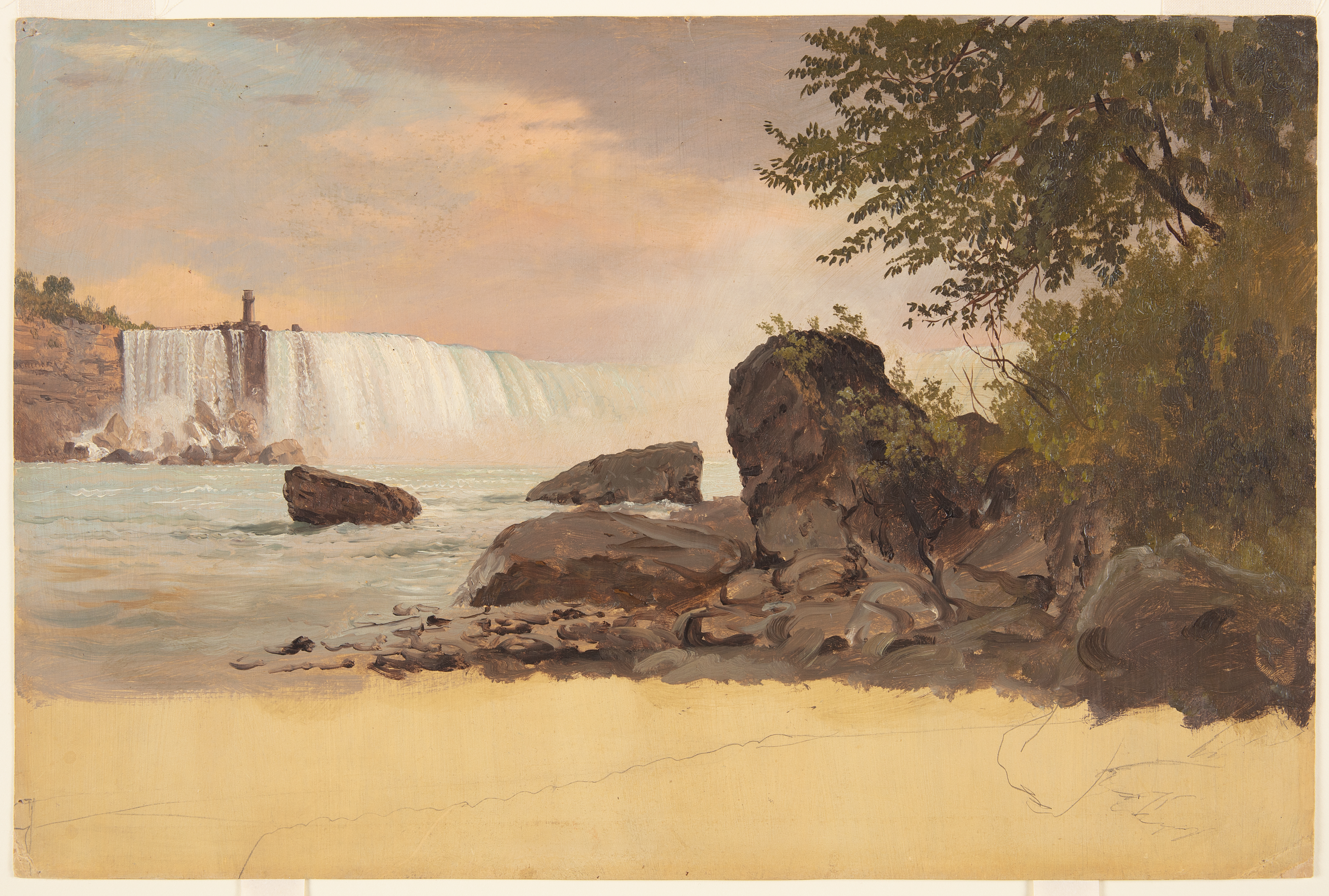 Drawing, Horseshoe Falls and Goat Island from the Canadian Bank, Niagara Falls, Canada; Frederic Edwin Church (American, 1826–1900); USA; oil and graphite on tan paperboard; 29.5 × 44.5 cm (11 5/8 × 17 1/2 in.); Gift of Louis P. Church; 1917-4-766-a