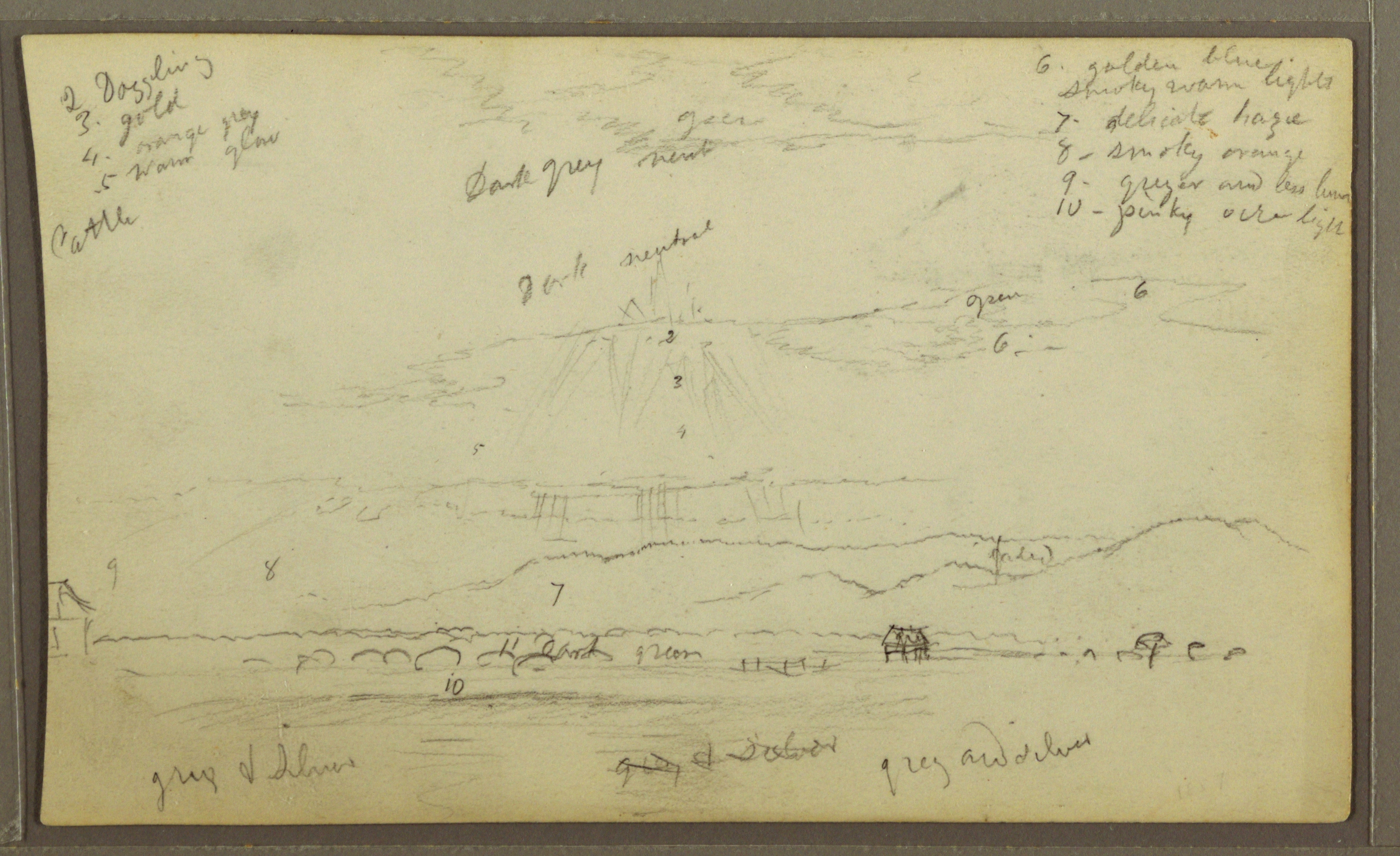 Inscribed: in graphite, upper left: 2 Dazzling / 3 - gold / 4 - orange grey / 5 warm glow / cattle; in graphite, upper center: open / Dark grey neut; in graphite, upper right: 6 - golden blue / smoky warm lights / 7 - delicate haze / 8 - smoky orange / 9 - greyer and less lum / 10 - pinky ocre light; in graphite, center: Dark neutral / 2 / 3 / 4 / 5; in graphite, center right: open / 6 / 6 / faded; in graphite, lower left: 9 8 / grey & silver; in graphite, lower center: 7 / Dark green / 10 / [struckout: grey & silver]; in graphite, lower right: grey and silver; in graphite, verso upper left: Raft; in graphite, verso upper right: Canoe with plantains / light green and yellow; in graphite, verso lower left: Hanging chicken coops