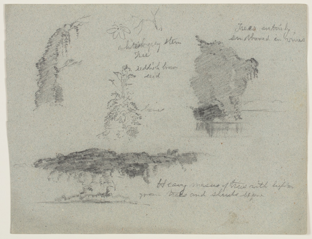 Inscribed in graphite, upper center: white grey stem / Tree / reddish brown / seed; center: leaves; upper right: Trees entirely / smothered in vines; lower right: Heavy masses of trees with lighter / green trees and shrubs before