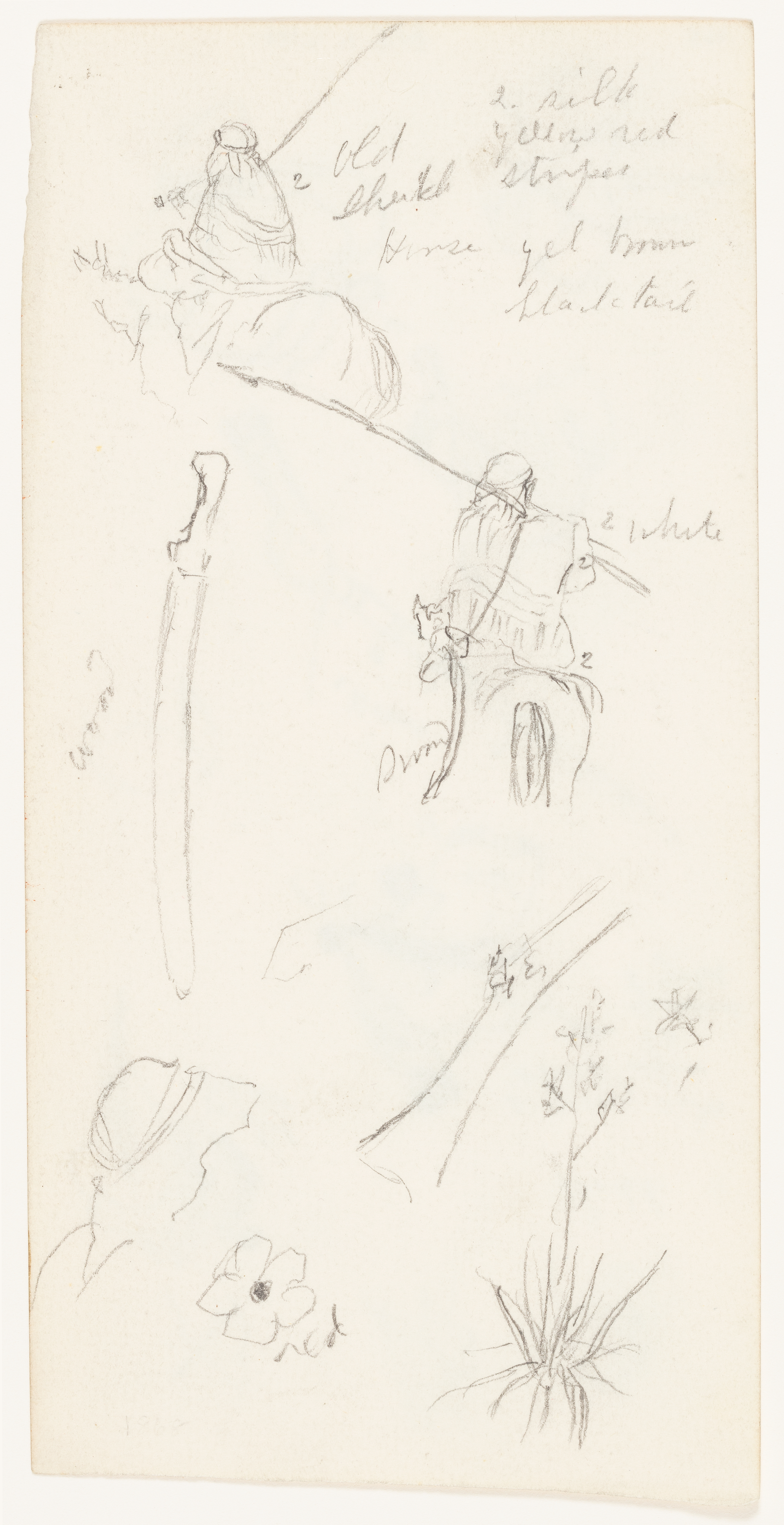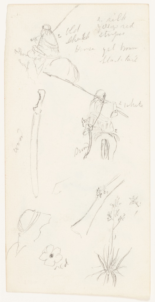 Inscribed: in graphite, upper center: 2 old / sheikh Horse; in graphite, upper right: 2 silk / yellow red / stripes / yel brown / black tail; in graphite, center left: wood; in graphite, center right: 2 white / 2 / sword; in graphite, lower left: 2; in graphite, verso upper left: water / skins; in graphite, verso upper center: black; in graphite, verso upper right: Sheikh / 2 2 - wrong side / sheep skin / bt / sienna / & gold; in graphite, verso center: rich / Brass / 2 2
