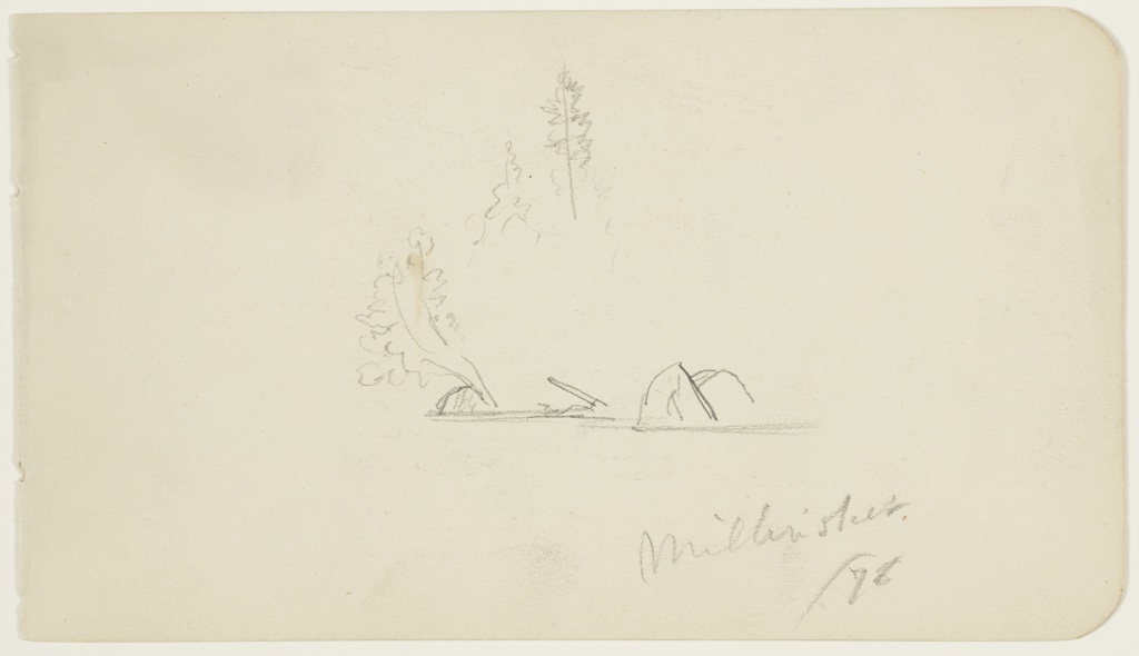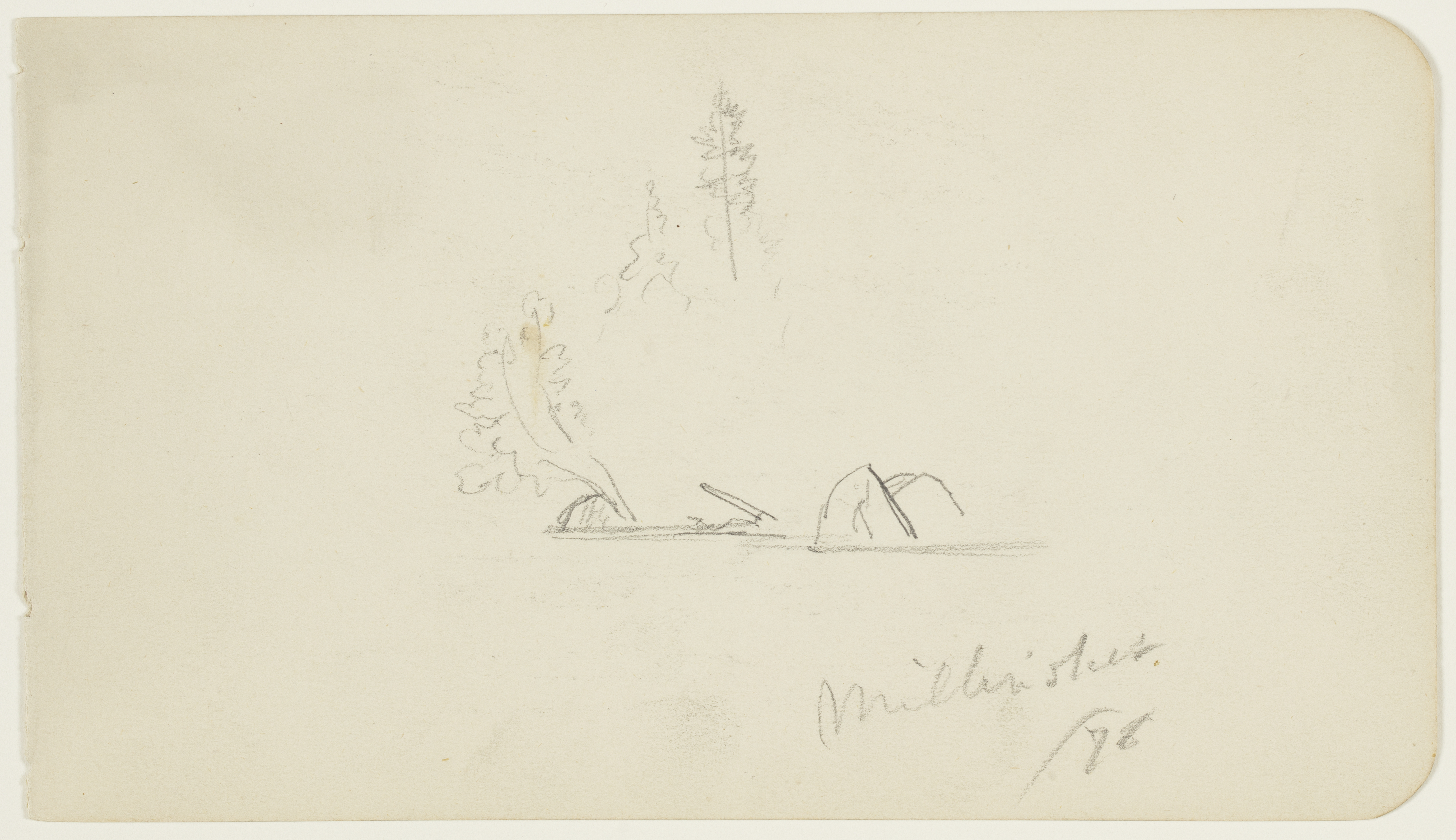 Drawing, Boulders and Trees along Lake Millinocket, Maine; Frederic Edwin Church (American, 1826–1900); USA; graphite on white wove paper; 10.2 × 17.9 cm (4 in. × 7 1/16 in.); Gift of Louis P. Church; 1917-4-973-b