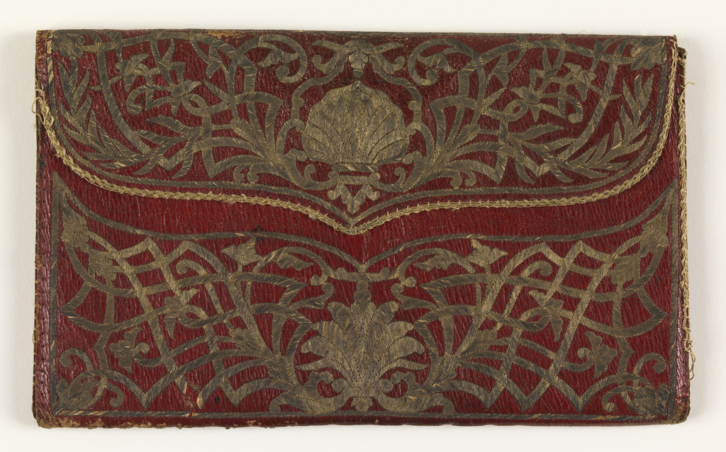 This is a Pocket book. It is dated late 19th–early 20th century and we acquired it in 1918. Its medium is leather, metallic thread and its technique is embroidered. It is a part of the Textiles department.