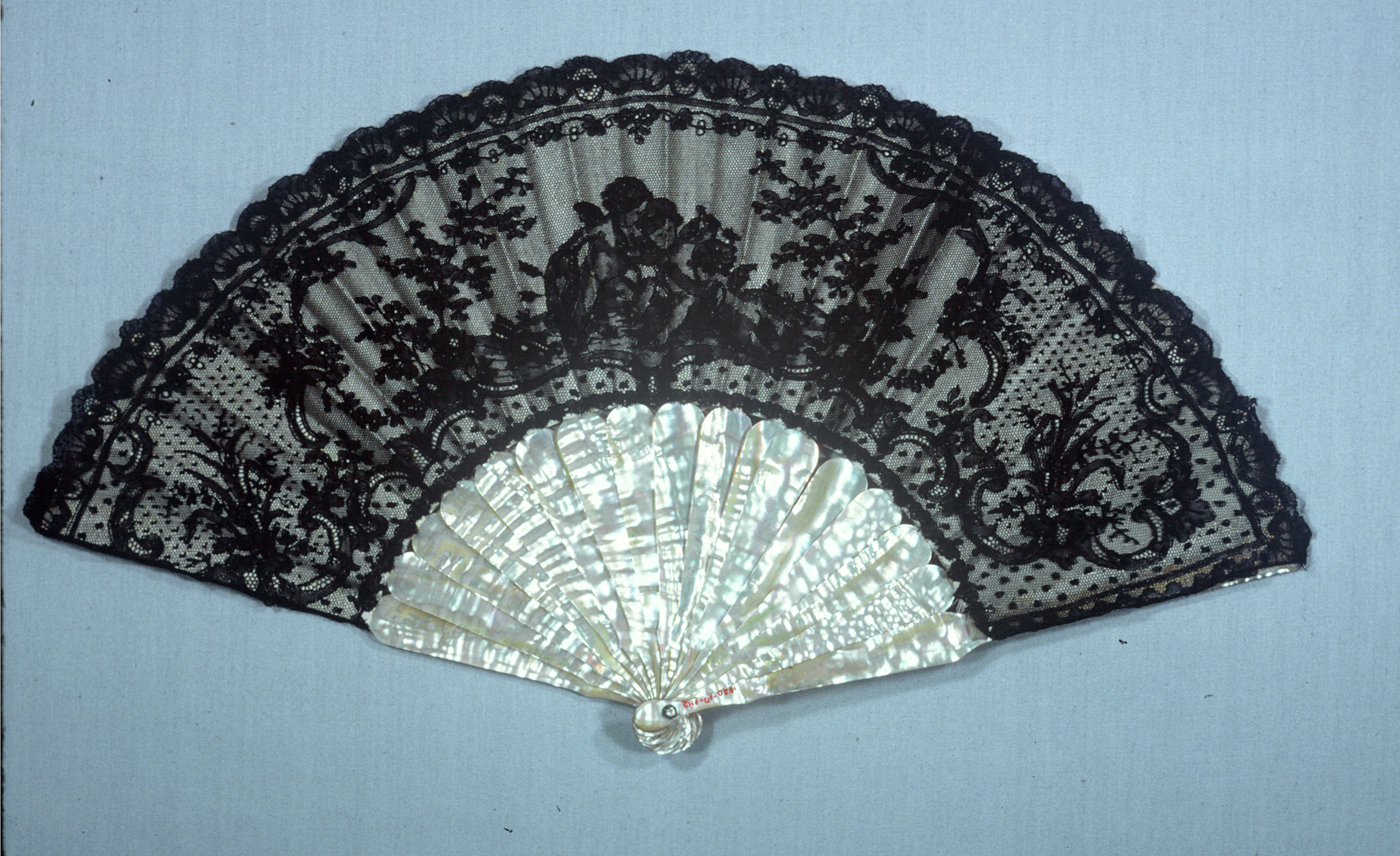 This is a Pleated fan. It is dated 19th century and we acquired it in 1920. Its medium is lace leaf with silk satin backing; mother-of-pearl sticks. It is a part of the Textiles department.