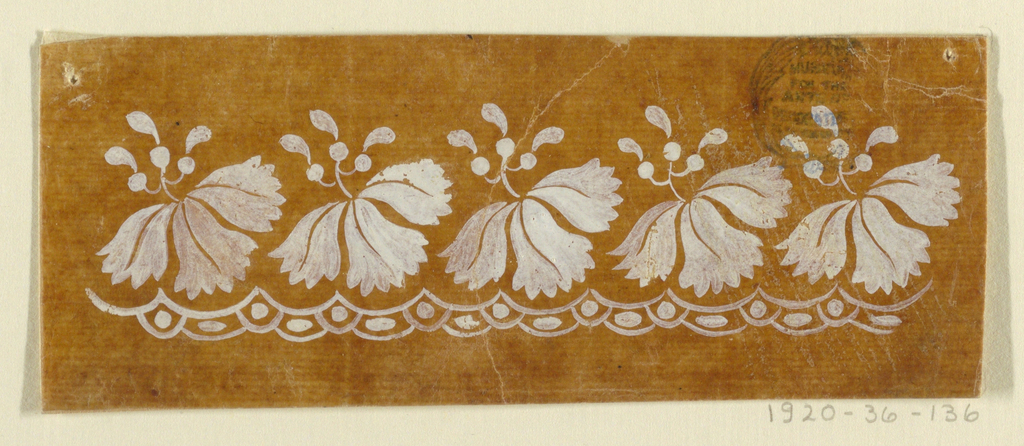 Drawing, Design for an Embroidered or Woven Horizontal Border of the "Fabrique de St. Ruf"; Designed by Fabrique de Saint Ruf; France; brush and white gouache on glazed tracing paper; 5.1 × 13 cm (2 in. × 5 1/8 in.); Gift of Eleanor and Sarah Hewitt; 1920-36-136