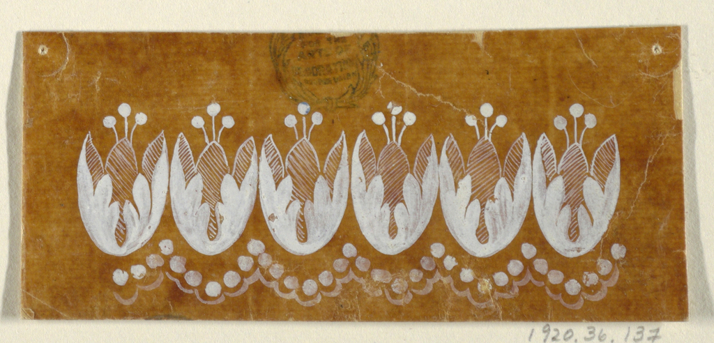 Drawing, Design for an Embroidered or Woven Horizontal Border of the "Fabrique de St. Ruf"; Designed by Fabrique de Saint Ruf; France; brush and white gouache on glazed tracing paper; 5 × 11.4 cm (1 15/16 × 4 1/2 in.); Gift of Eleanor and Sarah Hewitt; 1920-36-137