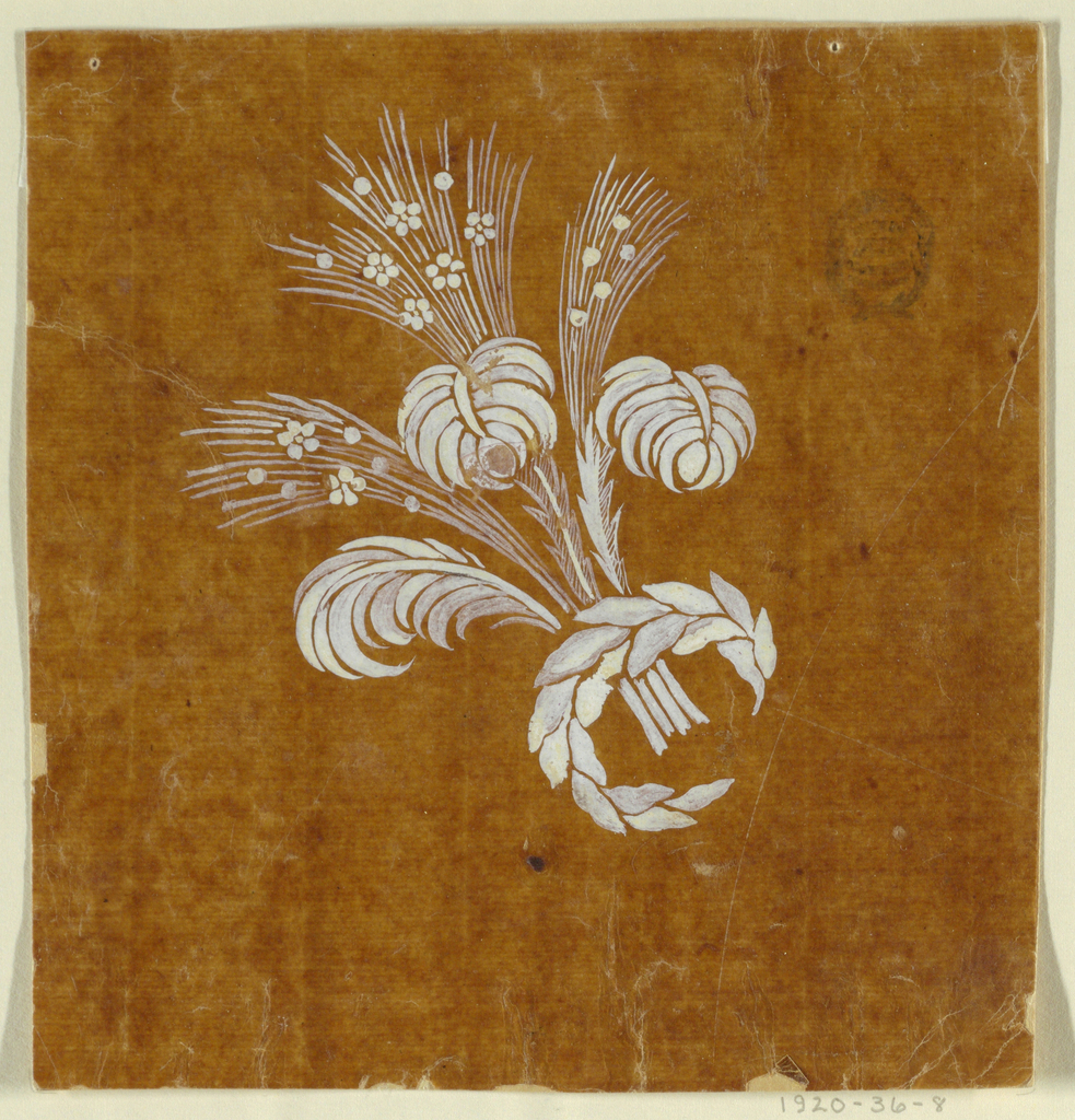 Drawing, Design for an Embroidered or Woven Nosegay of the "Fabrique de St. Ruf"; Designed by Fabrique de Saint Ruf; France; brush and white gouache on glazed tracing paper; 15.8 × 15 cm (6 1/4 × 5 7/8 in.); Gift of Eleanor and Sarah Hewitt; 1920-36-8