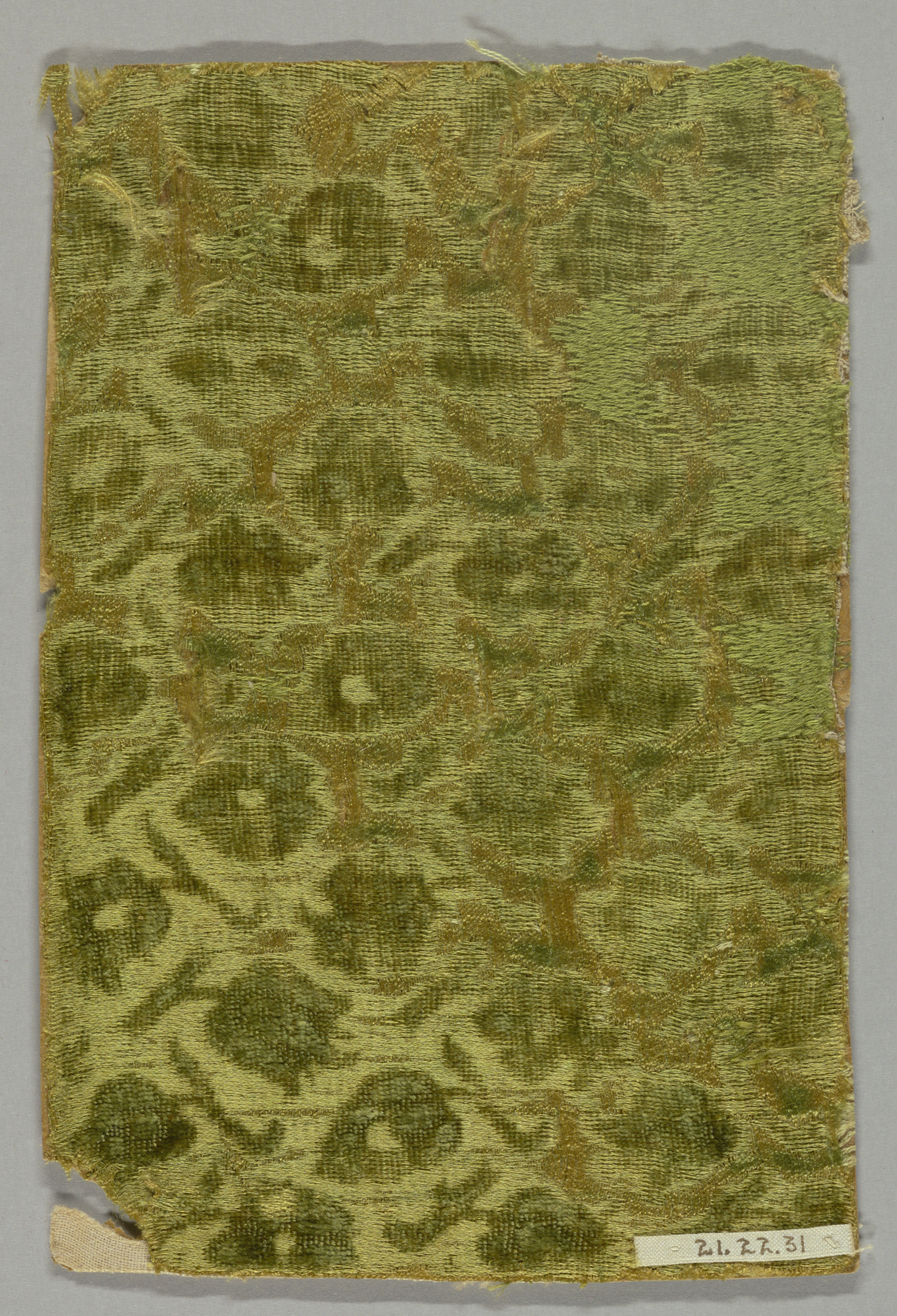 This is a Fragment. It is dated late 16th–early 17th century and we acquired it in 1921. Its medium is silk and its technique is cut and uncut supplementary warp pile (velvet) on satin ground. It is a part of the Textiles department.