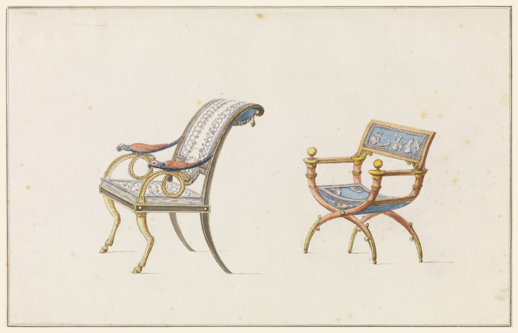 Drawing, Design for Two Chairs; Designed by Jean Démosthène Dugourc (French, 1749–1825); Attributed to Georges Jacob (French, 1739–1814), Henri Jacob (1753–1824); France; brush and watercolor, pen and black ink, graphite on white laid paper; 21.3 x 34 cm (8 3/8 x 13 3/8 in.); Purchased for the Museum by the Advisory Council; 1921-6-133-2