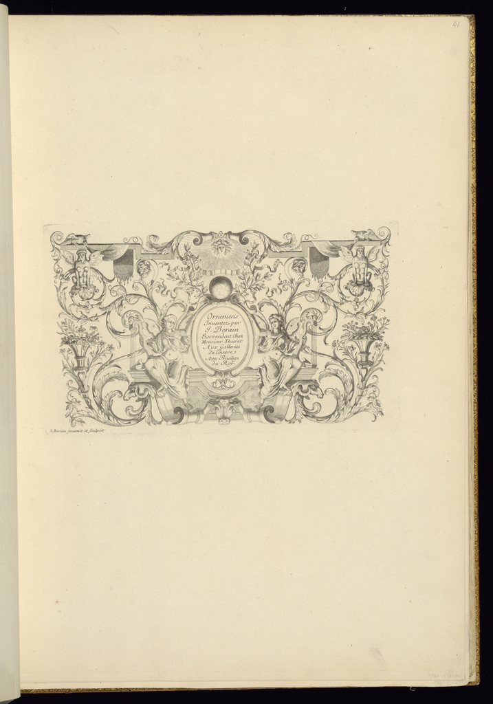 Printed center, in plate: Ornemens / Inventez par / J. Berain / Et se vendent Chez / Monsieur Thuret / Aux Galleries / du Louvre / Avec Privilege / du Roy.; Inscribed in graphite, upper right, in margin: 41; Inscribed in graphite, lower right, in margin: 1921-6-201(41)