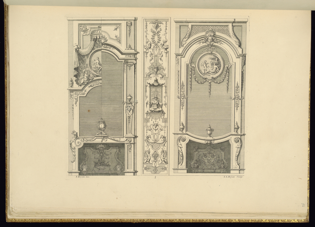 Bound Print, Chimneypiece Designs; Designed by Jean Bérain the Elder (French, 1640–1711); Print Maker: Jean-Louis Baujan (French, 1676–17..); Published by Jacques Thuret (French, 1669–1738); Dedicatee: Jules Hardouin Mansart (French, 1646–1708); France; engraving on laid paper; Purchased for the Museum by the Advisory Council; 1921-6-201-92