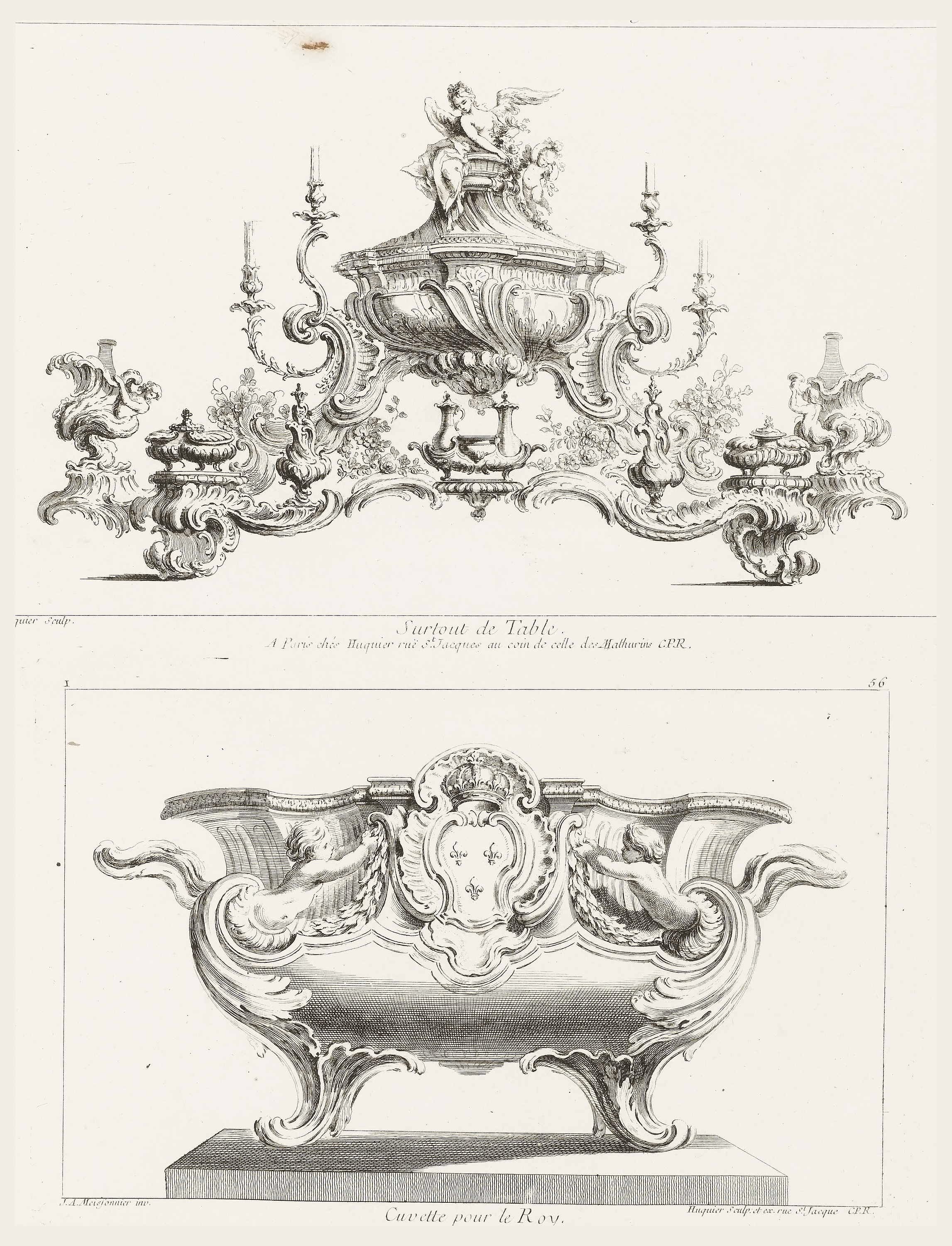 Inscribed on plate, upper left: I; upper center: Neuvieme Livre des Oeuvres de J.A. Meissonnier; upper right: 55; lower left: Huquier Sculp.; lower center: Surtout de Table/A Paris ches Huquier ruë St. Jacques au coin de celle des Mathurins C.P.R.