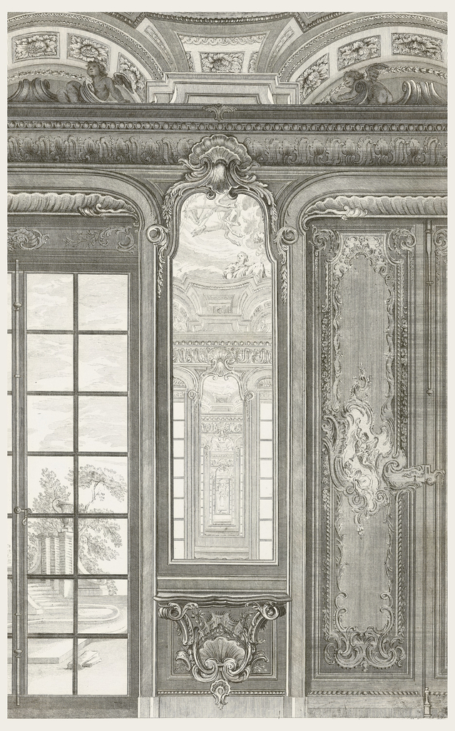 Print, Vue des trumeaux du même Cabinet; Vue des trumeaux du même Cabinet, 3rd Plate; Designed by Juste-Aurèle Meissonnier (French, b. Italy, 1695–1750); Engraved by Maruice Baquoy (French, 1680 – 1747); Published by Gabriel Huquier (French, 1695–1772); France; engraving on white laid paper; Platemark: 54.1 x 34.5 cm (21 5/16 x 13 9/16 in.); Purchased for the Museum by the Advisory Council; 1921-6-212-47