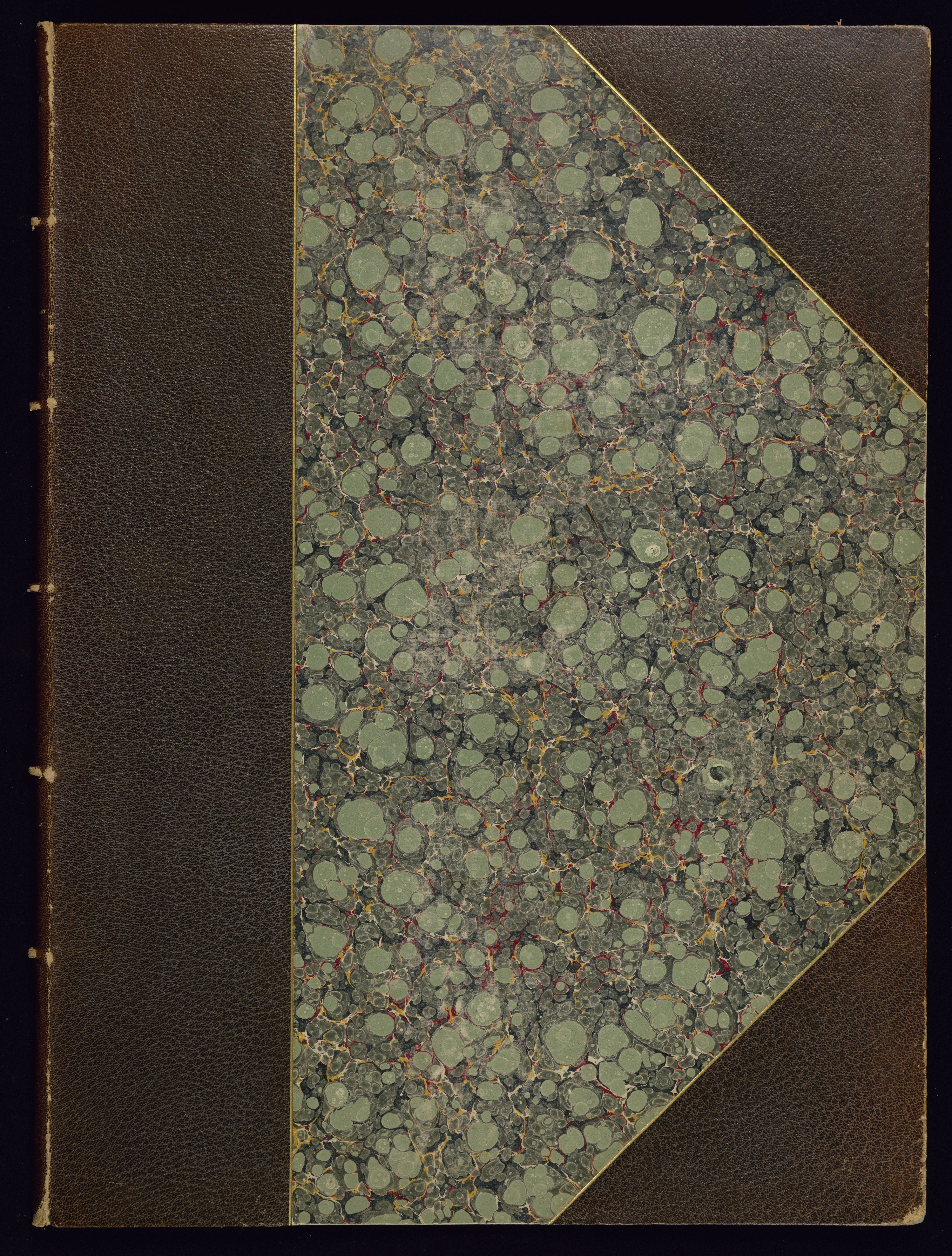 Book, Suite de dessins chinois (Album of Chinoiserie); Designed by Jean-Baptiste Pillement (French, 1728–1808); Print Maker: Pierre-Charles Canot (French, 1710 - 1777); France; gold tooling, morocco leather and marbled paper on boards, ink on paper.; 47.5 × 36 cm (18 11/16 × 14 3/16 in.); Purchased for the Museum by the Advisory Council; 1921-6-214
