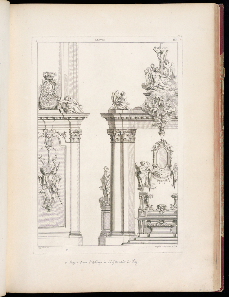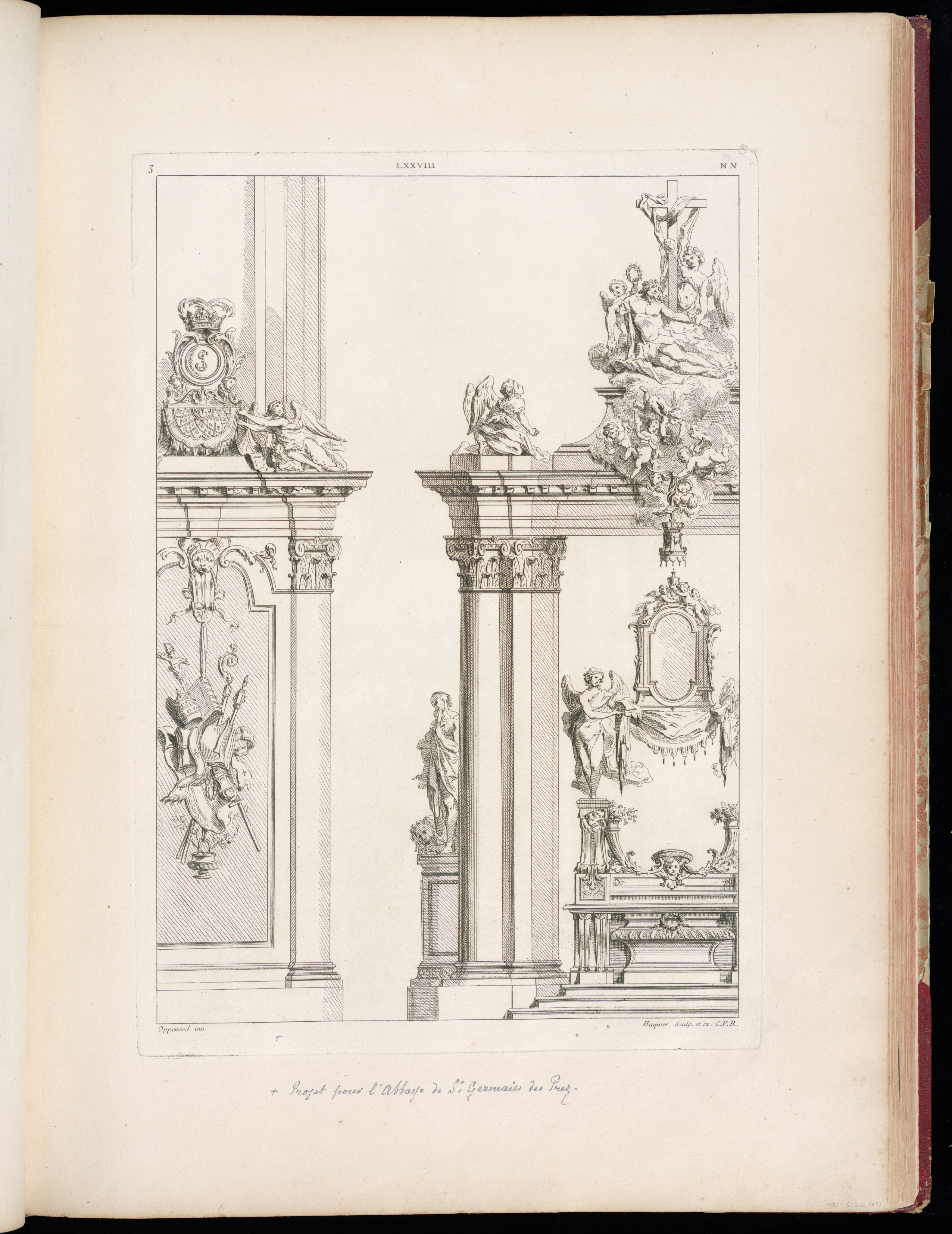 Printed upper left, in plate: 3; Printed upper center, in plate: LXXVIII; Printed upper right, in plate: NN; Inscribed in graphite, lower center, in plate: +; Inscribed in graphite, lower center, in margin: + Projet pour l'abbaye de St. Germain des Prez.; Inscribed in graphite, lower right, in margin: 1921-6-216 (45)