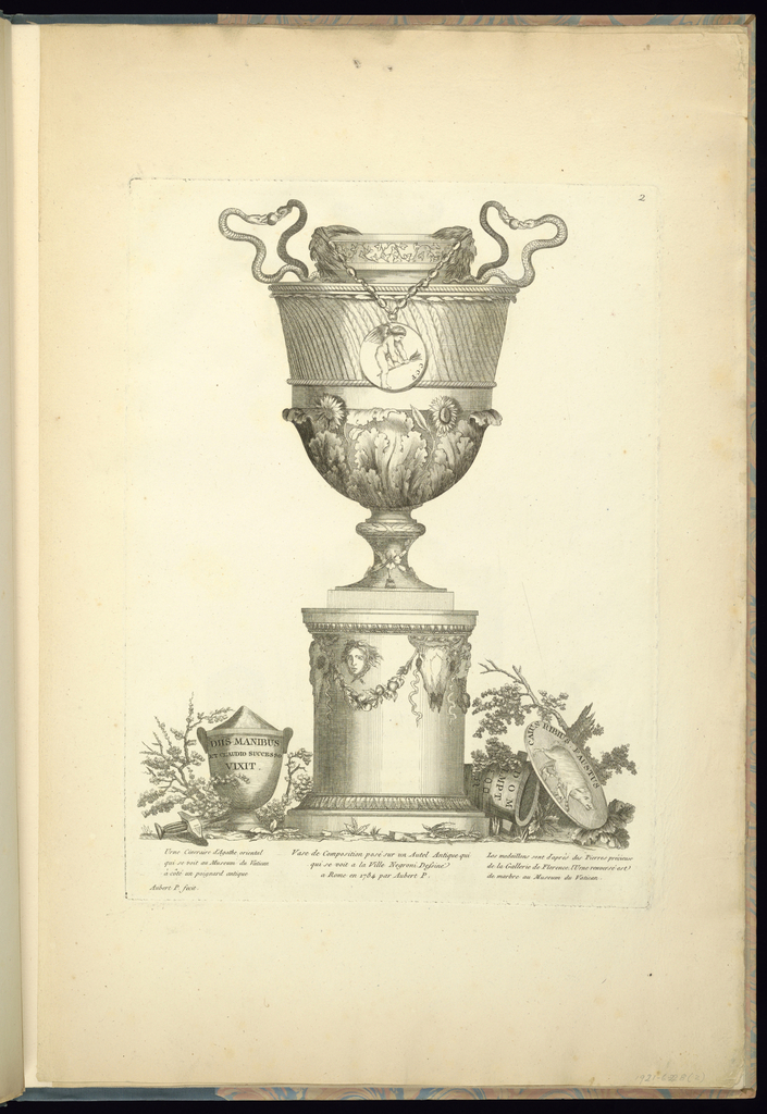Printed lower left to lower left center, in plate: Urne Cineraire d'Agathe oriental / qui se voit au Museum de Vatican / à côté un poignard antique; Printed lower center, in plate: Vase de Composition posé sur un Autel Antique qui / qui se voit a la Ville Negroni Dessiné / a Rome en 1784 par Aubert P.; Printed lower right, in plate: Les medallions sont d'après des Pierres précieuse / de la Gallerie de Florence. l'Urne renversé est / de marbre au Museum du Vatican.; Printed upper right, in plate: 2; Inscribed in graphite, lower right, in margin: 1921-6-228(2)